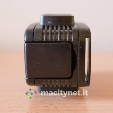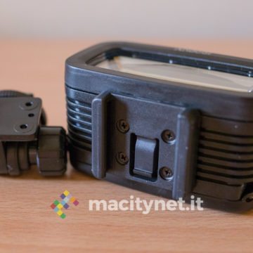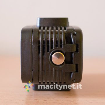 La torcia LED è progettata principalmente per l’uso con le action cam. Le dimensioni infatti sono vicine a quelle di una GoPro, mentre il peso, compreso di staffa per l’aggancio ad un treppiede, è di 170 grammi. Anche qui il materiale predominante è il policarbonato, della stessa fattura di quello impiegato per la maniglia anche se appare al tatto ancora più resistente.