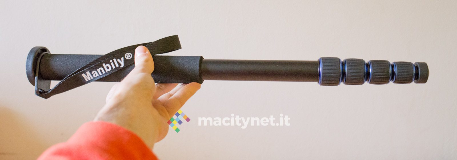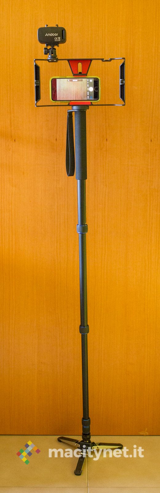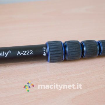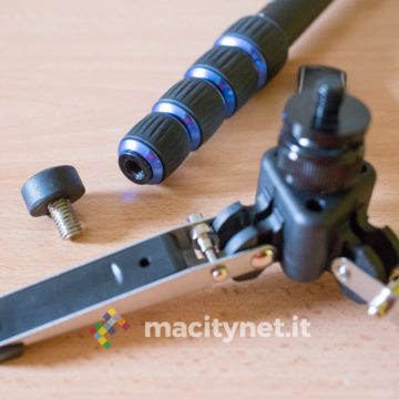 Tra i tre è quello che ci è piaciuto di più dal punto di vista dei materiali utilizzati. L’asta è infatti realizzata interamente in alluminio satinato, molto leggero e dall’aspetto davvero resistente. Il monopiede si compone di cinque aste telescopiche che, se aperte tutte, permette di raggiungere un’altezza di 170 centimetri da terra. Quando chiuso invece misura 50 centimetri.