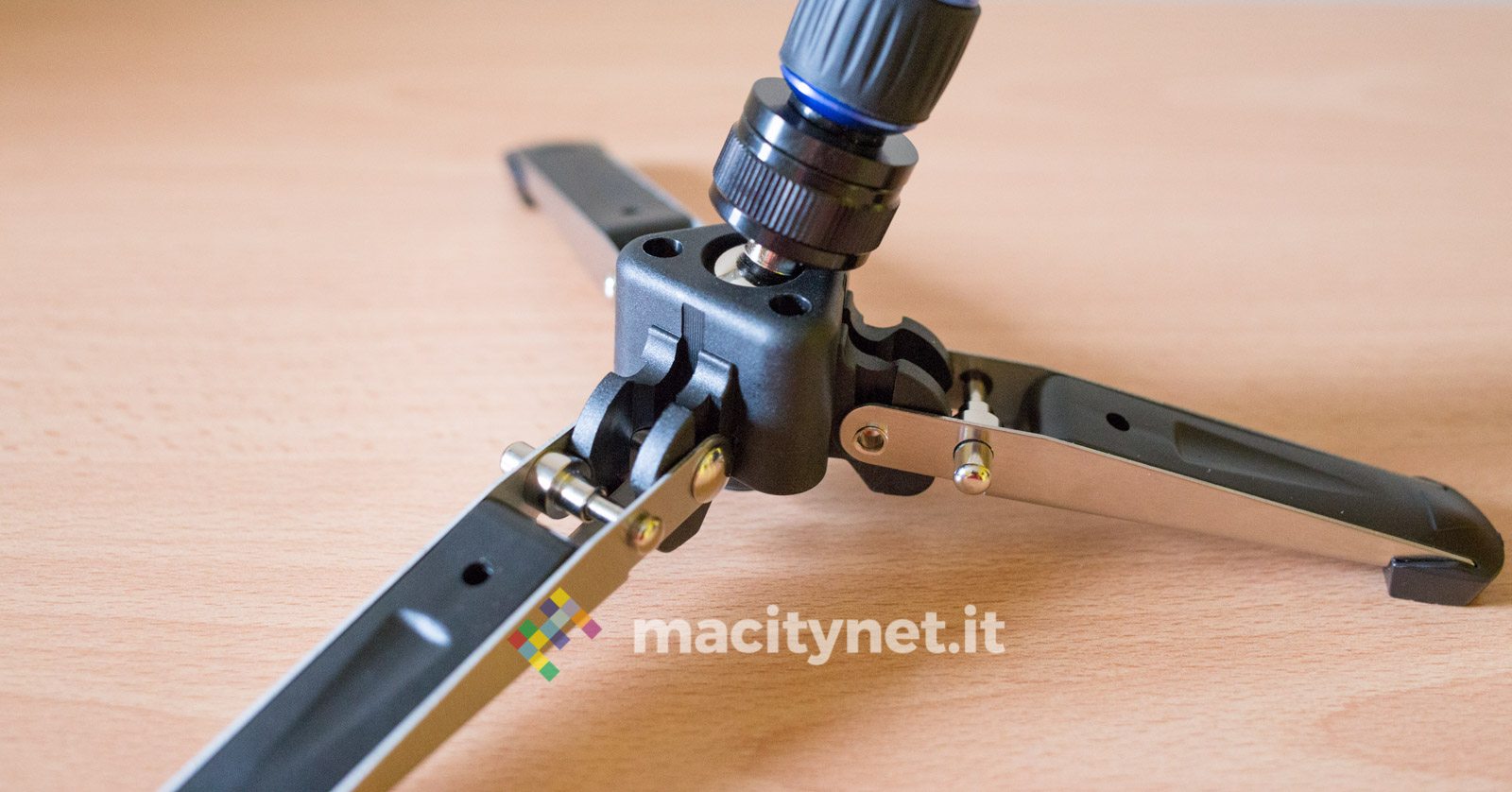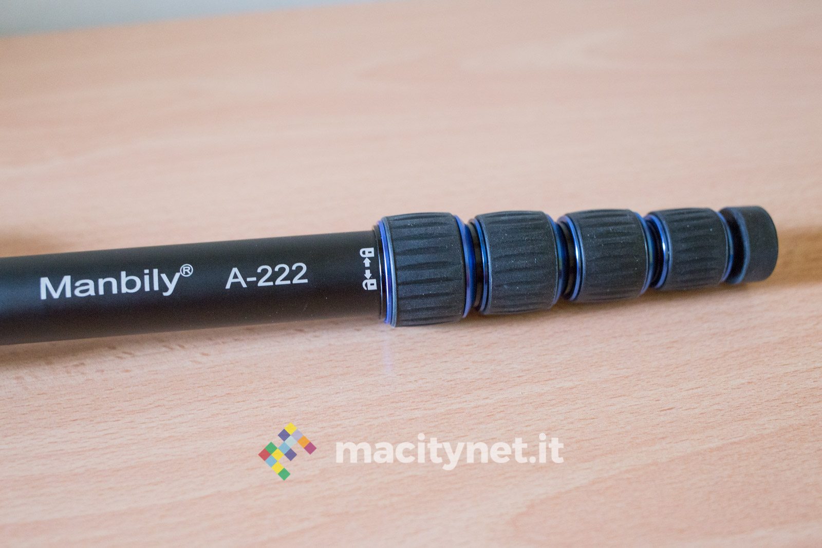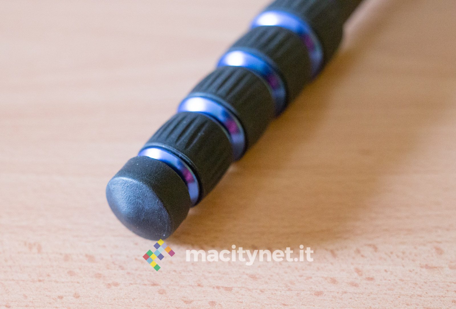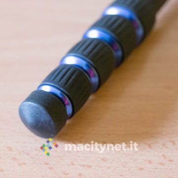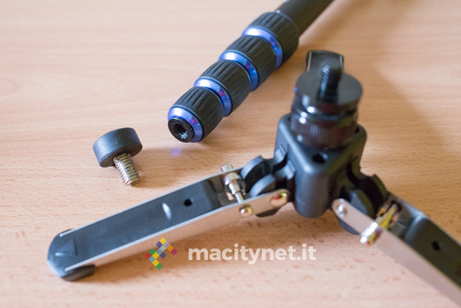L’apertura delle aste è gestita da quattro viti a sgancio rapido: chi scrive personalmente preferisce i sistemi con clip in quanto risultano più rapidi per l’apertura e chiusura delle varie aste, quello comunque usato dal monopiede di Andoer permette di svitare tutte e quattro le maniglie e regolare la lunghezza delle varie aste in circa 10-15 secondi. Ciascuna vite è accompagnata da una copertura in gomma con trama a righe in rilievo molto comoda in quanto assicura un’ottima presa anche con i guanti.