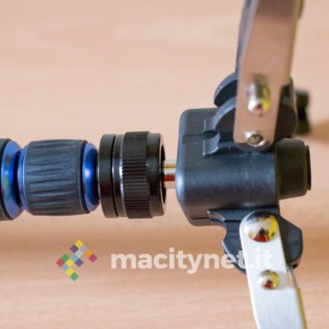 La punta inferiore del monopiede è in gomma ma nella confezione troviamo anche una punta intercambiabile con mini-treppiede, utilissima nelle riprese video perché permette di sostenere perfino una reflex e, grazie alla testa a sfera, garantisce un’ottima fluidità per i movimenti. I movimenti dell’asta possono anche essere limitati svitando una vite che ne blocca ogni inclinazione e si rivela molto utile soprattutto se si intende utilizzare il sistema per un’autoscatto anche con attrezzatura pesante come una reflex: all’aperto o in caso di forte vento non sarà certo stabile come un comune treppiede ma permette comunque di stabilizzare un autoscatto o una foto paesaggistica con tempi di scatto abbastanza rapidi.