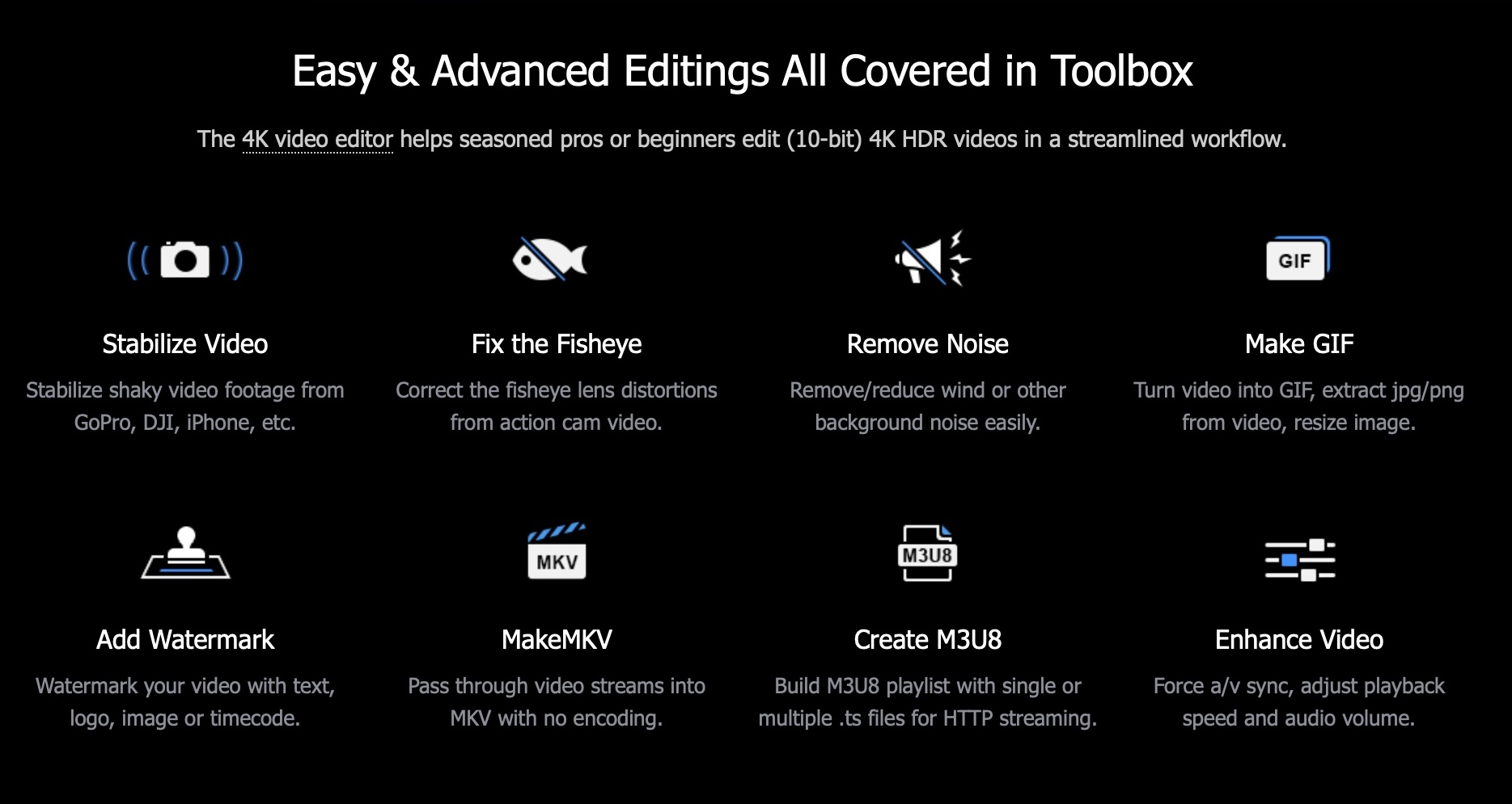 VideoProc offre una gamma di strumenti di editing intuitivi per migliorare i video per: