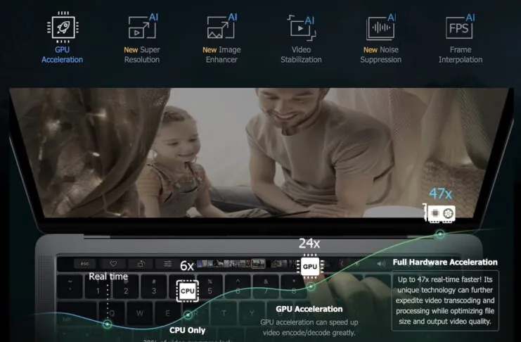 Con VideoProc, è possibile massimizzare la potenza dell’hardware del proprio computer tramite l’accelerazione GPU completa, aumentando significativamente la velocità di elaborazione video fino a 47 volte più velocemente in tempo reale. Questa funzionalità garantisce un editing e una conversione fluidi senza sacrificare la qualità, rendendolo la soluzione ottimale per video 4K UHD e file di grandi dimensioni.