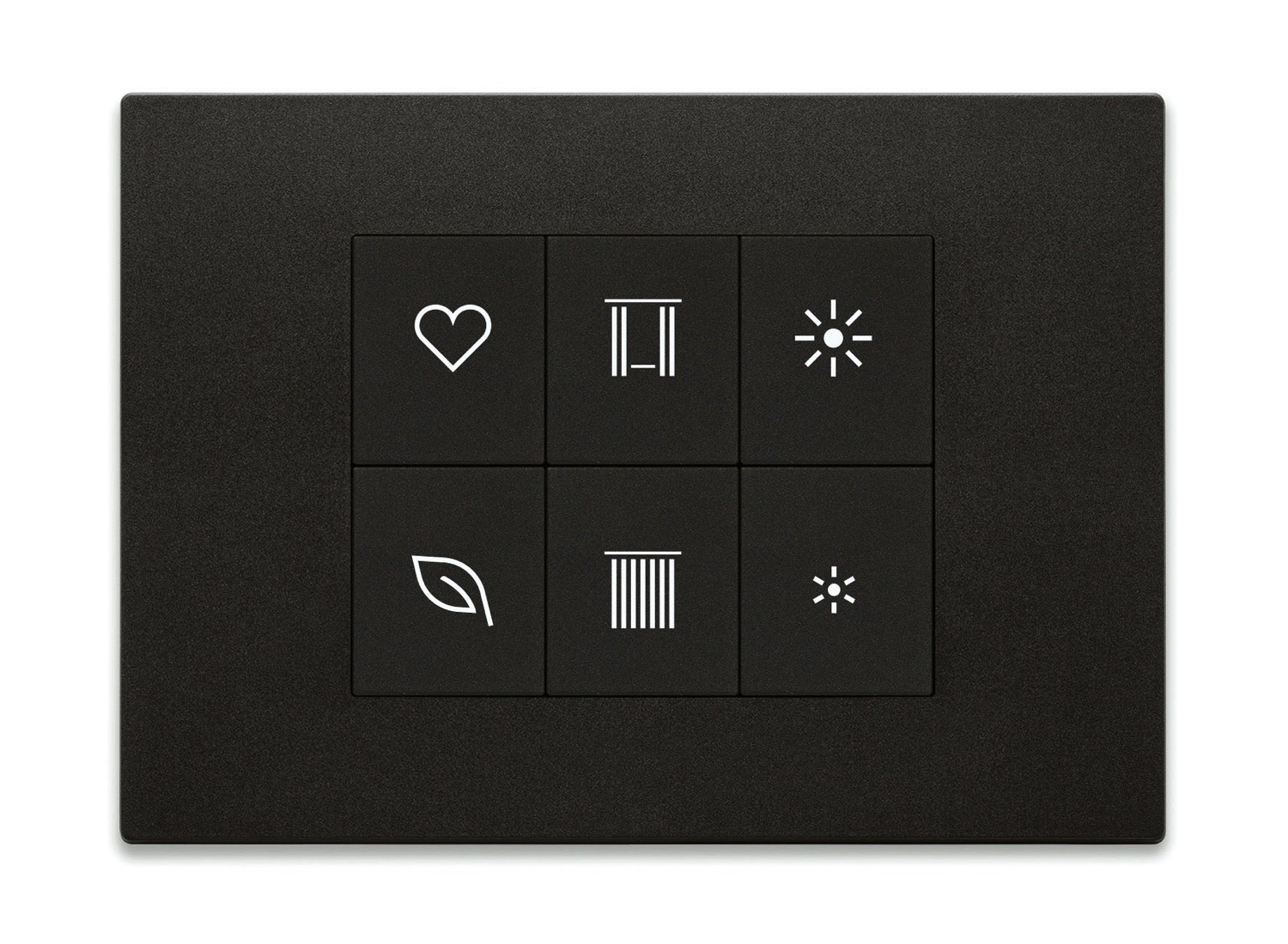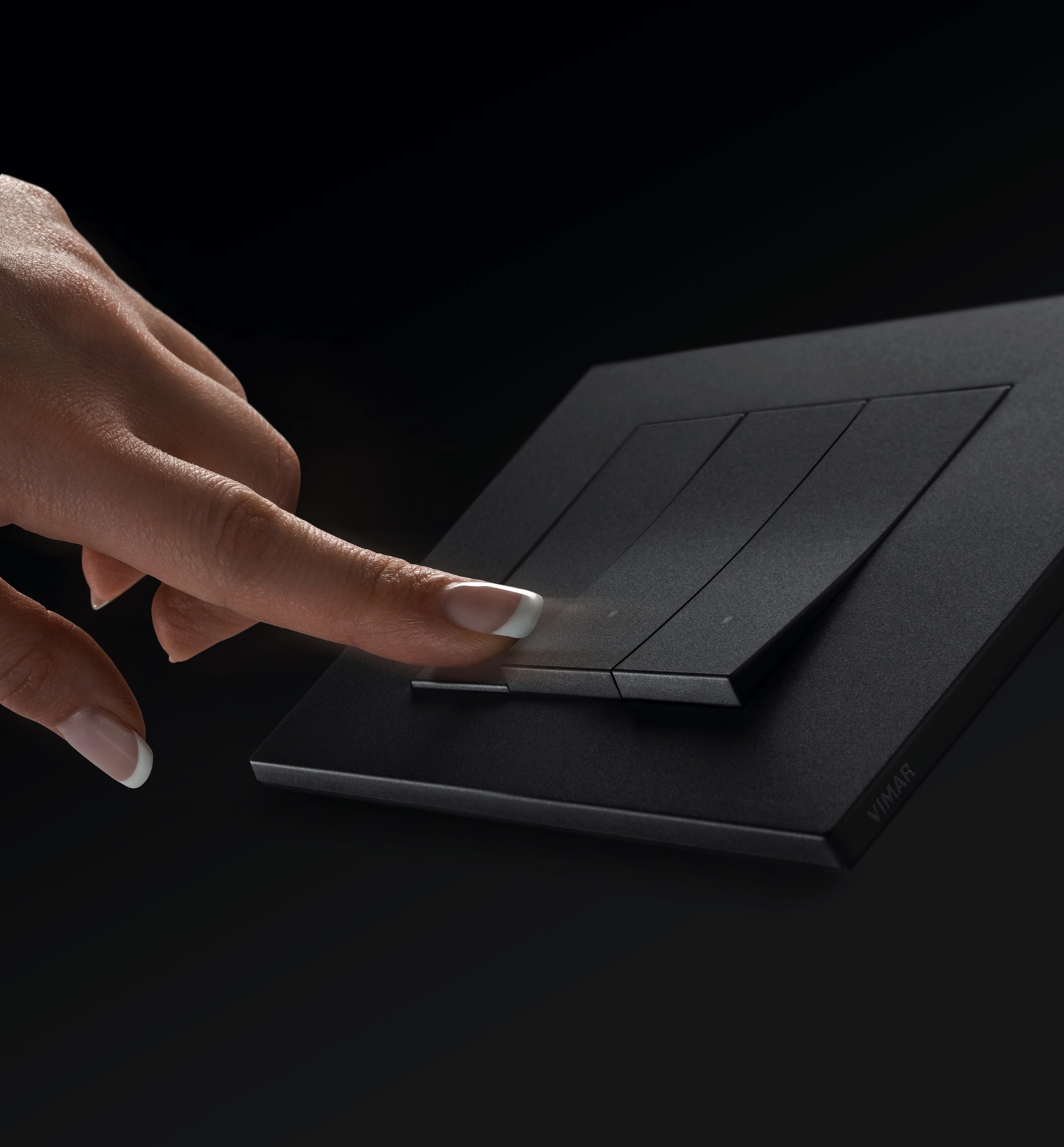 La leggera sporgenza del singolo comando con una larga superficie 53 millimetri lo rendono facilmente individuabile al tatto che va a sfiorare il tasto con una speciale finitura ad effetto seta. Una volta azionato, il comando torna in posizione garantendo un allineamento sempre perfetto grazie alla tecnologia brevettata In-line.