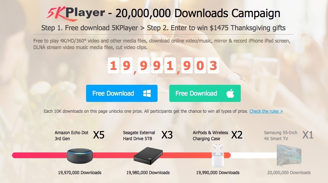 Per partecipare basta collegarsi all’apposita pagina e cliccare sul pulsante verde (per i possessori di Mac) o blu (per i possessori di PC) per scaricare gratis la versione appropriata di 5KPlayer, inserendo poi l’indirizzo email nel box che comparirà successivamente al click, indispensabile per essere contattati in caso di vincita.