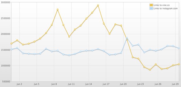 Il 20 giugno però le cose precipitano, così come le condivisioni di Vine: fra il 19 e il 20 del mese in questione i link per Vine su Twitter passano da circa 2.5 milioni al giorno a 1.5 milioni, scendendo poi sotto il milione; Instagram schizza verso l’alto e si piazza ora costantemente attorno al 1.5 milioni di condivisione giornaliere. Il social network fotografico ha dragato utenti direttamente da Vine, abbassandone le condivisioni in maniera drastica.