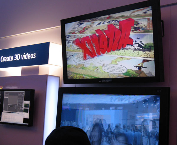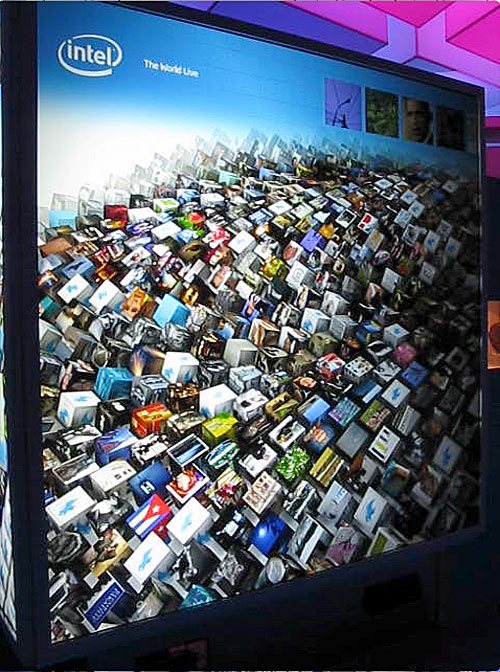 Tra le sezioni più visitate dello stand Intel ricordiamo quelle dedicate alle tecnologie wireless e alle soluzioni per grafica e immagini 3D. Nella foto che riportiamo qui in basso è ripreso uno schermo speciale in grado di visualizzare immagini 3D senza l’ausilio degli occhiali speciali. Questa particolare tecnologia 3D inganna l’occhio umano offrendo un efficace effetto di profondità : la scritta appare in primo piano rispetto al resto, naturalmente questo sensazione non è percepibile dalla macchina fotografica.