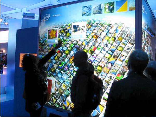 Concludiamo questa visita virtuale alle principali tecnologie mostrate al CES da Intel con il vincitore assoluto dell’interesse del pubblico. Si tratta della tecnologia InfoScape abbreviazione di Information Landscape. Questo sistema sviluppato da Intel prevede l’impiego di un grande schermo sensibile al tocco controllato da un sistema Intel Core i7 quad core. Per mostrare la consistente potenza di calcolo dei nuovi processori gli ingegneri Intel hanno sviluppato un sistema in grado di raccogliere le informazioni da milioni di feed sul Web. Ogni feed è visualizzato sulla faccia di un cubo 3D, il tutto viene poi visualizzato in tempo reale creando un panorama 3D d’effetto. Ad ogni aggiornamento in tempo reale il mare di cubi che compone InfoScape viene scosso da una piccola onda con un effetto grafico di grande impatto visivo. I visitatori del CES erano invitati a toccare lo schermo InfoScape: ad ogni tap sul display il cubo si ingrandiva mostrando il primo livello e le informazioni associati a quel feed. InfoScape è una tecnologia dimostrativa creata per mostrare le potenzialità dei processori e degli applicativi in grado di offrire grande facilità d’uso, immediatezza e senza dubbio un coinvolgimento particolare per l’utente che lo utilizza.