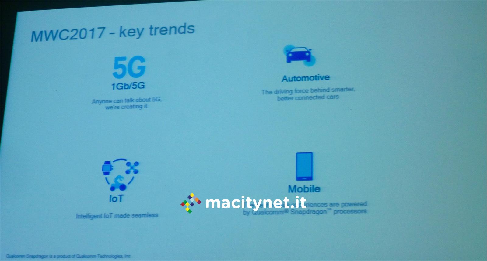 In questa ottica sempre a MWC17 la multinazionale ha presentato Qualcomm Snapdragon X50, prima gamma di modem 5G del mercato con supporto sia per la tecnologia 3GPP che 5G NR globale. Questo modem può operare sia nello spettro inferiore ai 6 GHz sia su mmWave risultando così una soluzione estremamente versatile in un ampia serie di scenari di utilizzo e implementazioni, inclusi gli smartphone next gen di alta gamma in arrivo nel 2019. Un dispositivo mobile dotato di Snapdragon X50 5G potrà collegarsi indifferentemente alle reti 2G, 3G, 4G e 5G con un singolo chip.