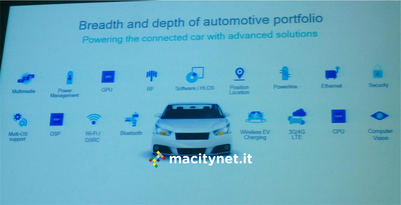 Qualcomm è sempre più attiva anche nel settore automotive dove tecnologie e componenti fino a poco tempo fa riservarti ai dispositivi mobile ora vengono sempre più integrati nelle automobili connesse, per le comunicazioni dati ma anche per l’intrattenimento e i servizi a bordo. Nel portfolio della società i processori Snapdragon 602A, 802A e anche i modem X12 e X5 LTE sono già impiegati da Audi, Wolkswagen e altri costruttori seguiranno presto.