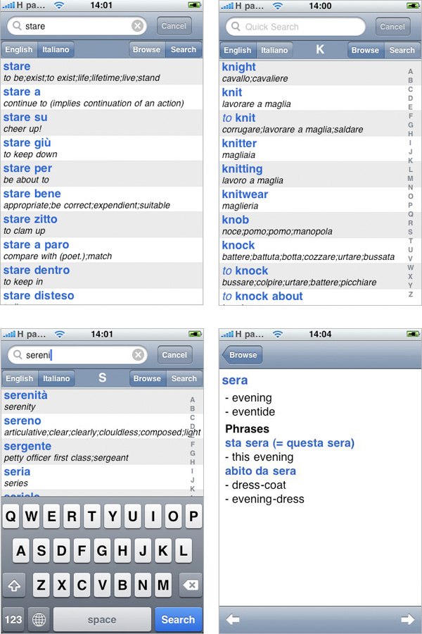E’ disponibile anche una funzione di ricerca intelligente e veloce: l’utente inizia a digitare le prime lettere della parola desiderata e il motore del dizionario visualizza in tempo reale i termini che iniziano con quelle lettere. In questo modo, nella maggior parte dei casi, con un numero limitato di digitazioni è possibile raggiungere velocemente la parola richiesta senza perdite di tempo e di pazienza. Infine con un tap sul termine otteniamo non solo la traduzione ma anche le espressioni associate: queste ultime sono altrettanti collegamenti cliccabili per saltare subito alla relativa traduzione. Vocabolario Italiano-Inglese è disponibile su App Store a 79 centesimi.