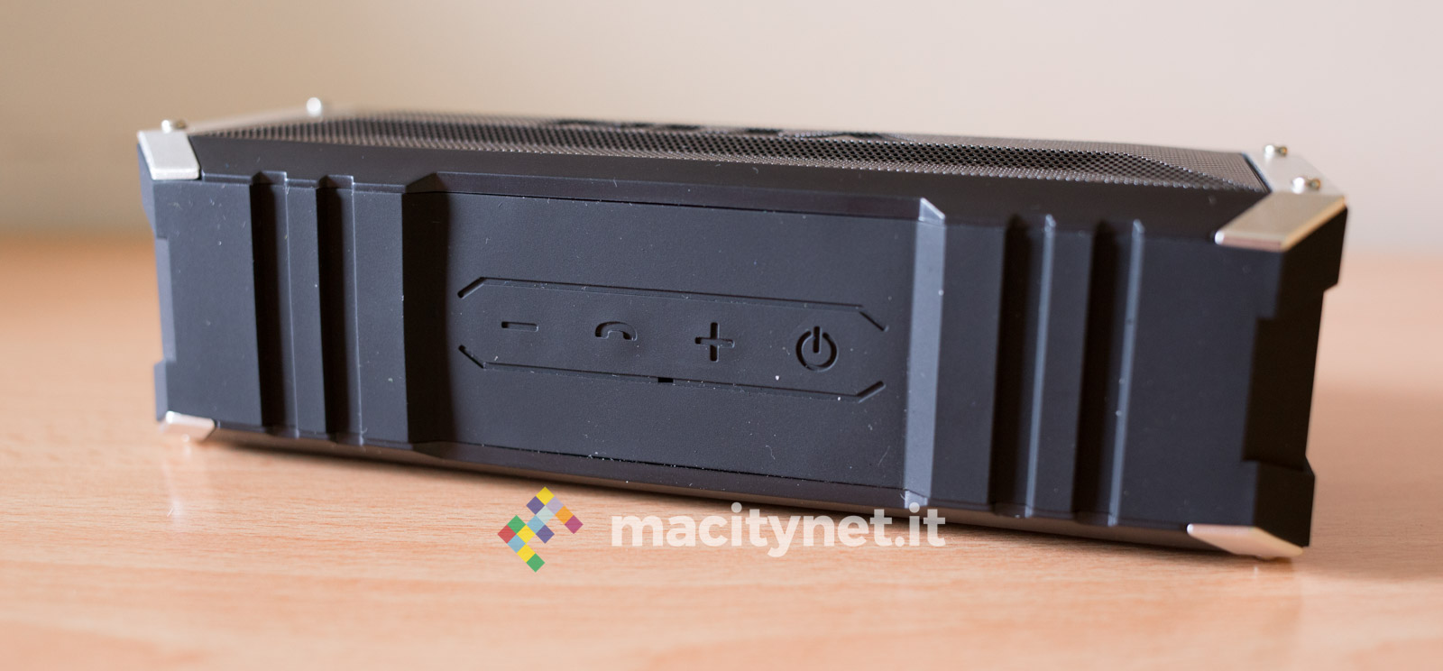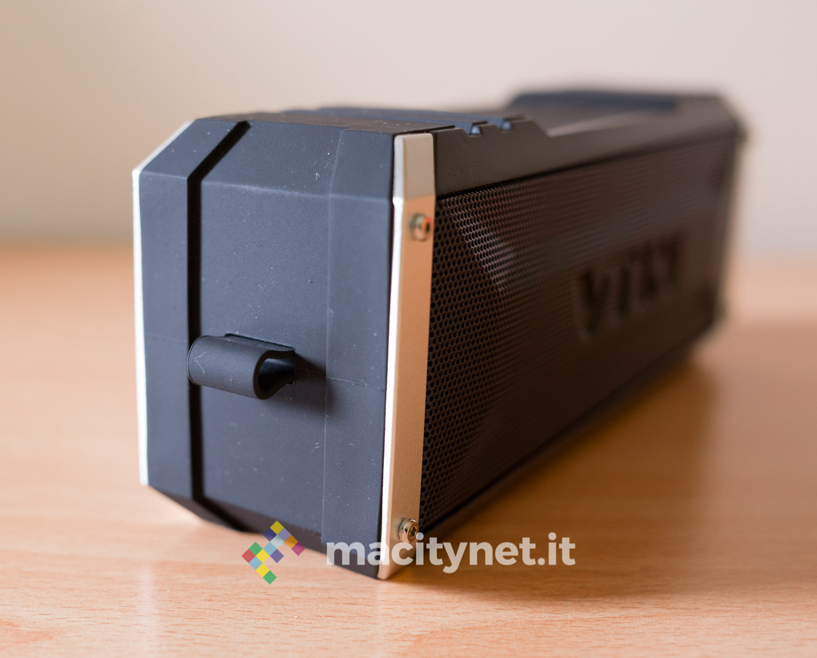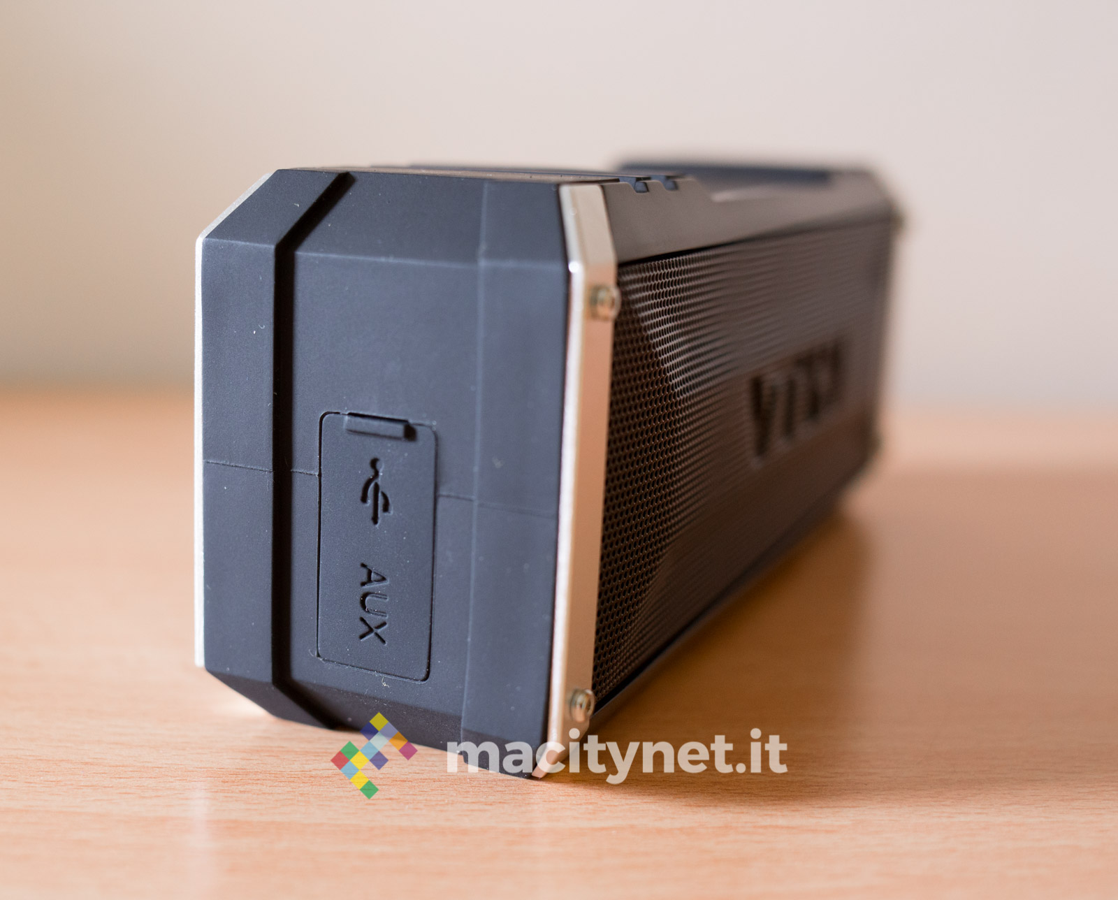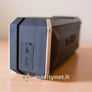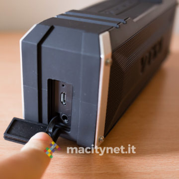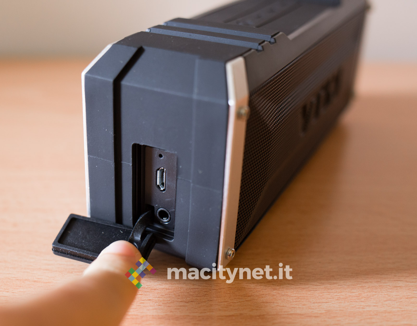 Su un lato c’è una linguetta in gomma alla quale è possibile agganciarvi il moschettone incluso nella confezione, in questo modo si potrà appendere a un passante dei pantaloni o alla cinghia di uno zaino e trasportarlo liberamente durante una passeggiata, dall’altro invece, ben protette da un tappo in gomma, ci sono le prese microUSB per la ricarica della batteria interna e la porta AUX per il collegamento ad un lettore MP3 via cavo jack da 3.5 mm (anch’esso lo trovate in confezione).