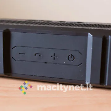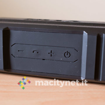 La superficie superiore incorpora infine il tasto ON/OFF, un LED di notifica, i tasti (+) e (-) per regolare il volume e saltare le tracce e il tasto contrassegnato da una cornetta telefonica che serve per l’appunto per gestire la parte telefonica ma funge anche da tasto Play/Pausa durante la riproduzione musicale.