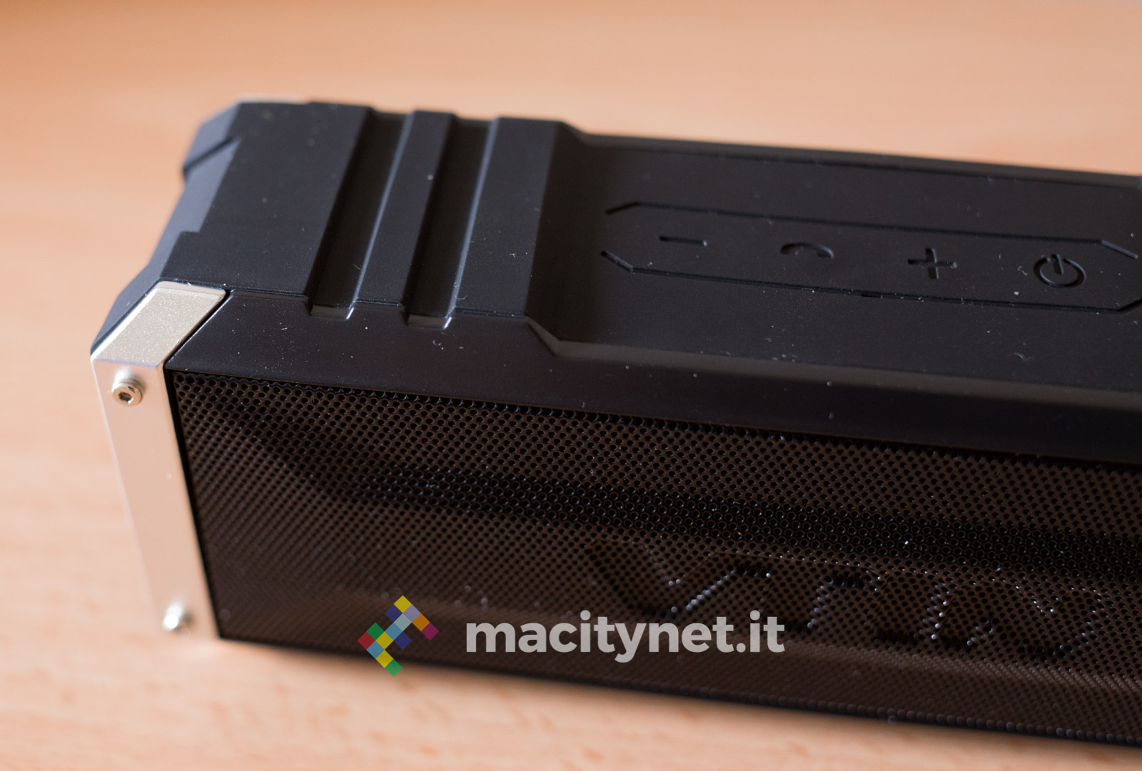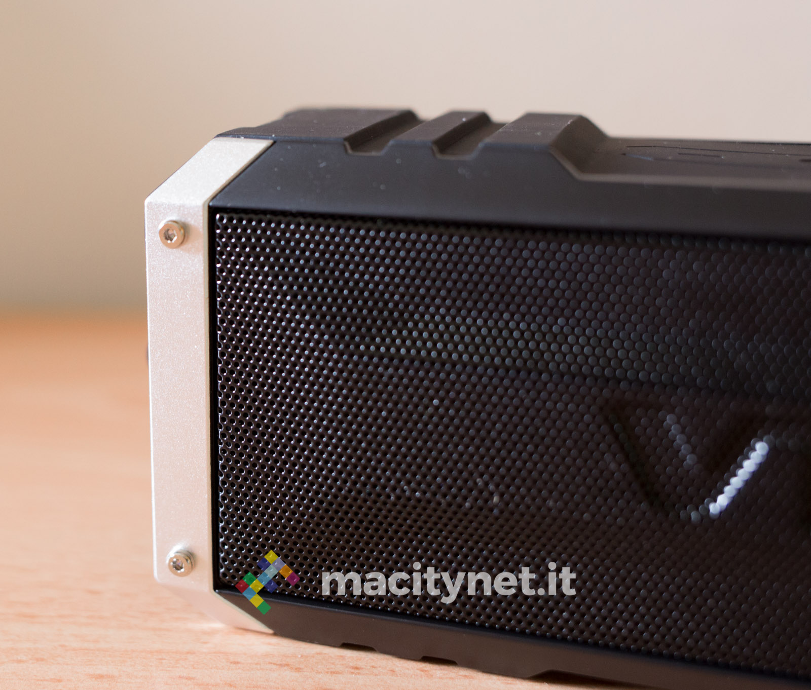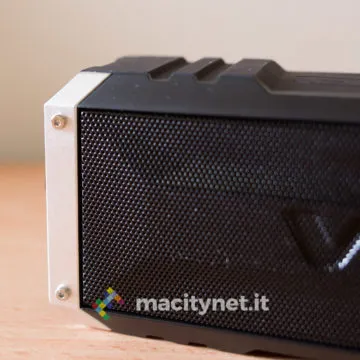 Come dicevamo, esteticamente è molto particolare. Ha una scocca in ABS con rivestimento gommato che ricopre gran parte della cassa: il design è molto spigoloso, con bordi seghettati che ne migliorano molto la presa rendendolo poco scivoloso anche se lo si appoggia su superfici leggermente inclinate. Abbiamo fatto un paio di prove sul bracciolo del divano ma immaginatevi di appoggiarlo sul bordo di una roccia o su una panchina: la stabilità è garantita.