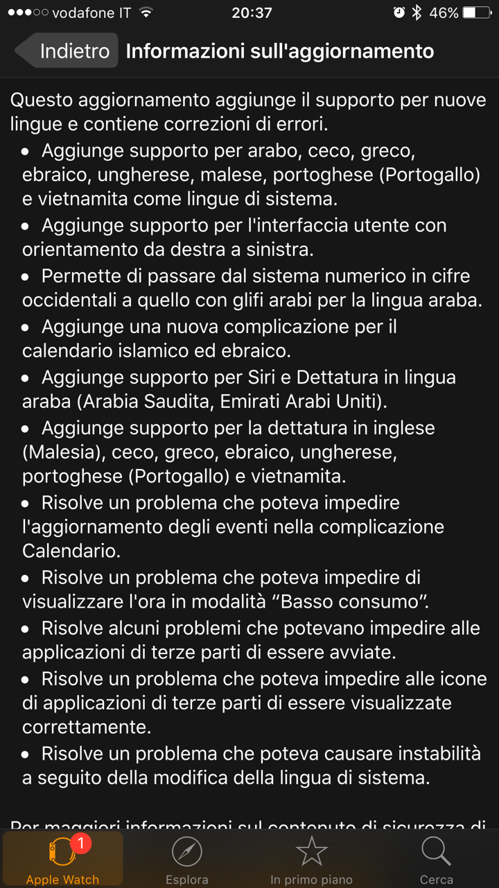 Tra i bug segnalati come risolti c’ un problema che poteva impedire l’aggiornamento degli eventi nella complicazione calendario, un problema che poteva impedire la visualizzazione dell’ora in modalità basso consumo e l’avvio di applicazioni di terze parti. Infine viene anche risolto un problema che poteva impedire alle icone di applicazioni di terze parti di essere visualizzate correttamente.