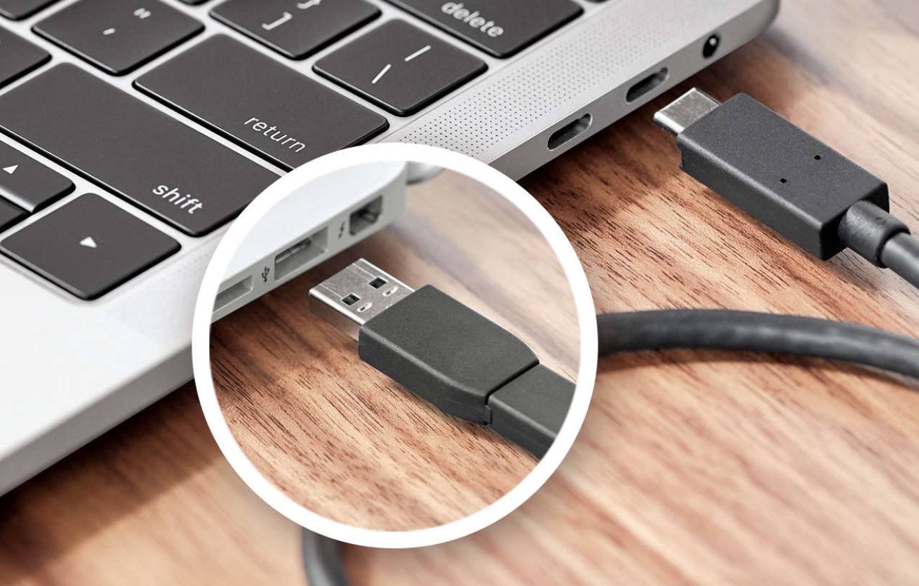 La porta USB-C consente il collegamento diretto ai Mac di ultima generazione; nella confezione è incluso un adattatore USB-A che permette il collegamento anche a Mac/PC con porta di precedente generazione.