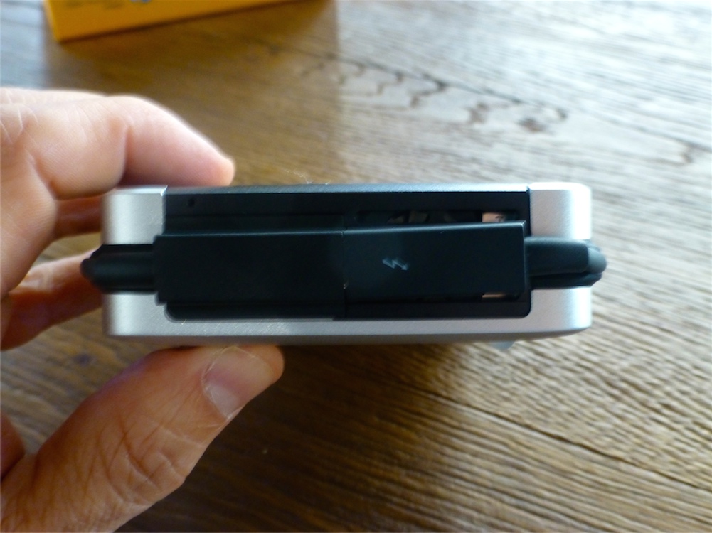 Interessante la soluzione di integrare il cavo e il connettore Thunderbolt direttamente nel WD My Passport Pro: quando il filo non è utilizzato, può essere completamente inserito in una piccola scanalatura che corre tutto intorno al dispositivo. Invece per iniziare a lavorare basta estrarre il connettore Thunderbolt dal suo alloggiamento ed estrarre il cavo dalla scanalatura, solo per la lunghezza desiderata. Questa soluzione è perfetta per i professionisti in movimento che non rischiano così di dimenticare un ulteriore cavo quando preparano la valigia e l’attrezzatura per una trasferta.