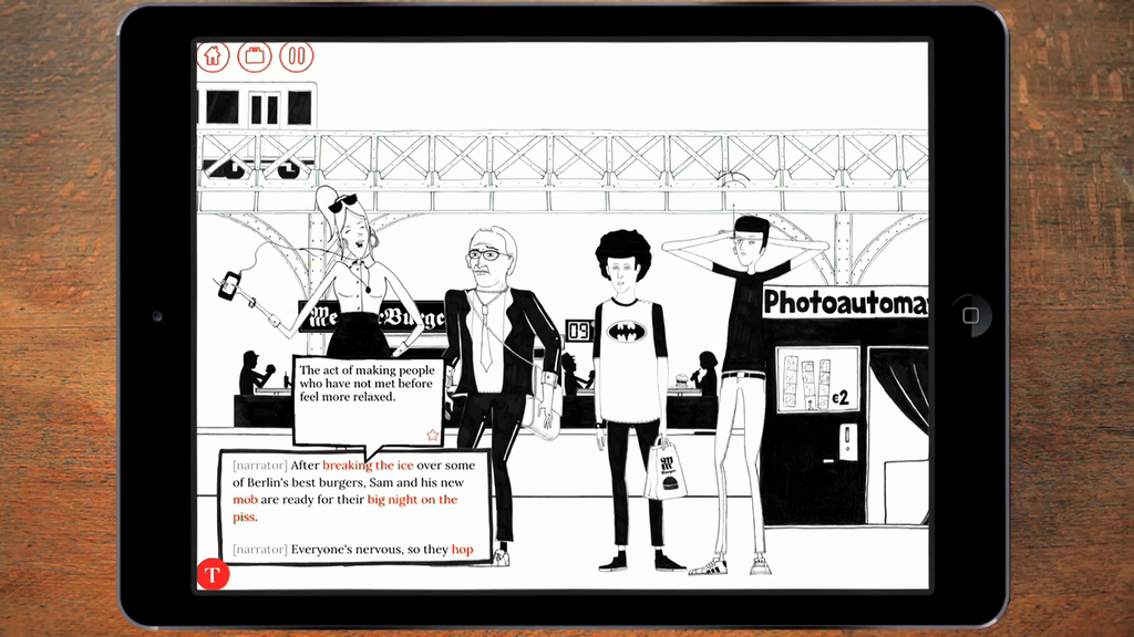 L’utente sarà coinvolto in un viaggio folle attraverso la notte di Berlino, in compagnia di due simpatici personaggi, Sam e Robin, che lo porterà in un universo hipster popolato da animali e persone surreali, tutto in bianco e nero: ascoltando le conversazioni, intervenendo nei dialoghi, scegliendo i termini giusti, chi è interessato ad approfondire l’inglese scoprirà l’uso corretto di alcune espressioni verbali e i modi di dire più usati nelle situazioni comuni.