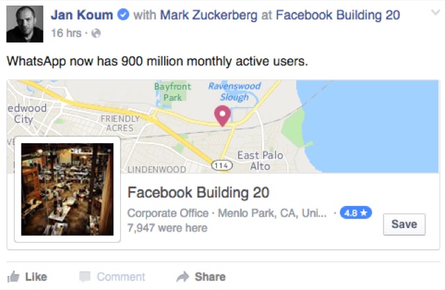Whatapp ha annunciato di aver raggiunto 900 milioni di utenti mensili attivi. La notizia arriva direttamente dall’account del fondatore Jan Koum che ha postato un messaggio sul suo account ufficiale di Facebook, pubblicamente visibile per tutti.