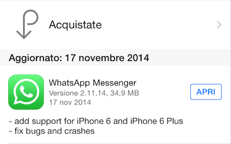 La nuova versione di Whatsapp ottimizzata per iPhone 6 e iPhone 6 Plus è identificata dal numero 2.11.14 e pesa circa 35 MB. Tra il changelog, ovviamente, la nota più interessante è data dal supporto nativo ai nuovi iPhone 6 e iPhone 6 Plus, che permette di avere un testo più piccolo e non più zoomato come in passato. Tra gli altri cambiamenti, invece, si ravvisano i classici bug e crash fix. Rimane, purtroppo, la conferma di lettura dei messaggi obbligatoria, simboleggiata dalla doppia spunta blu. Quasi certamente, con il prossimo aggiornamento sarà resa facoltativa, proprio come avvenuto per l’ultima versione di Whatsapp disponibile per Android.