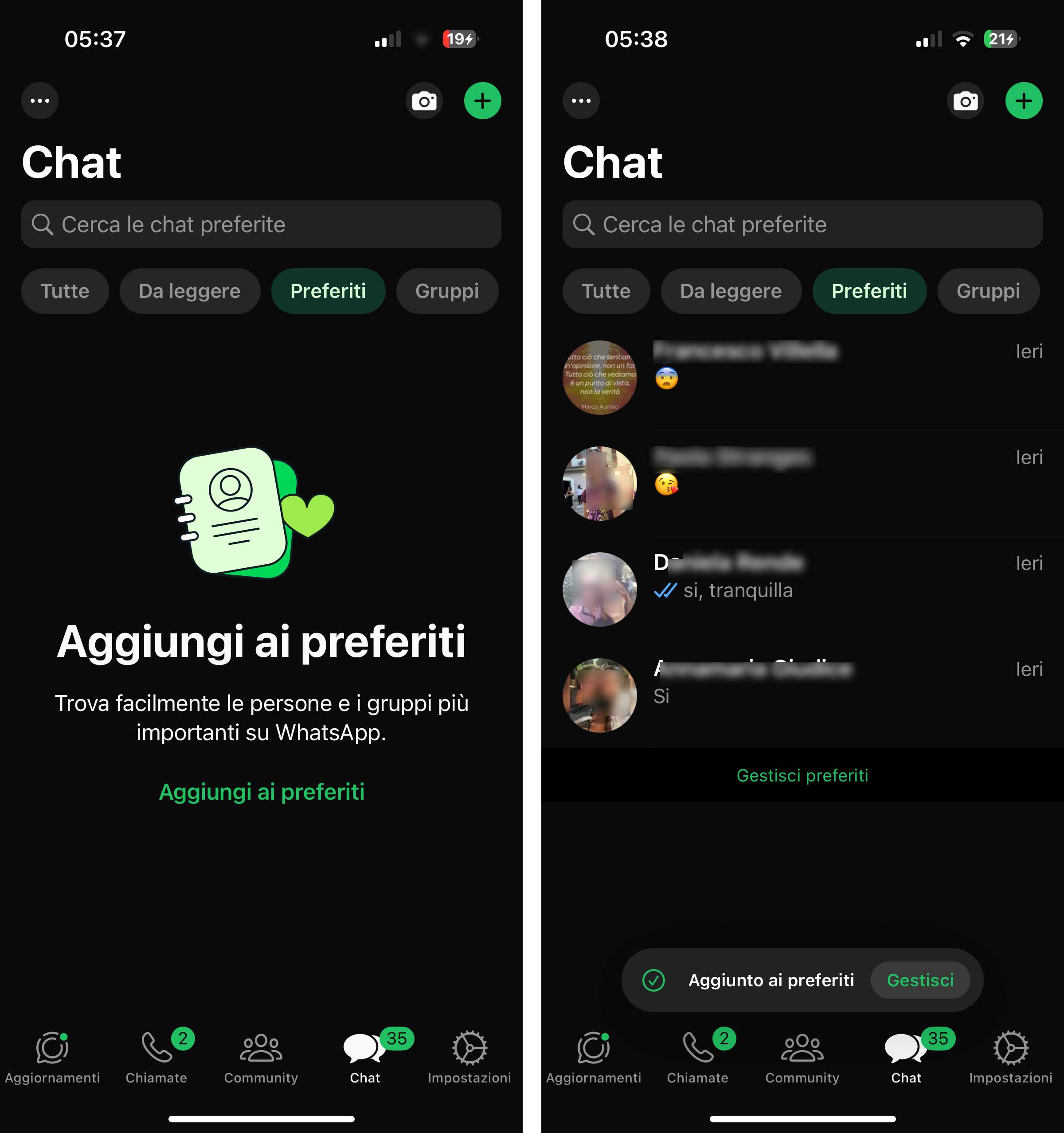 È possibile aggiungere elementi ai “preferiti” dalla schermata delle chat: basta seleziona il filtro “preferiti” (dalla parte superiore della schermata) e scegliere i contatti o gruppi da aggiungere.