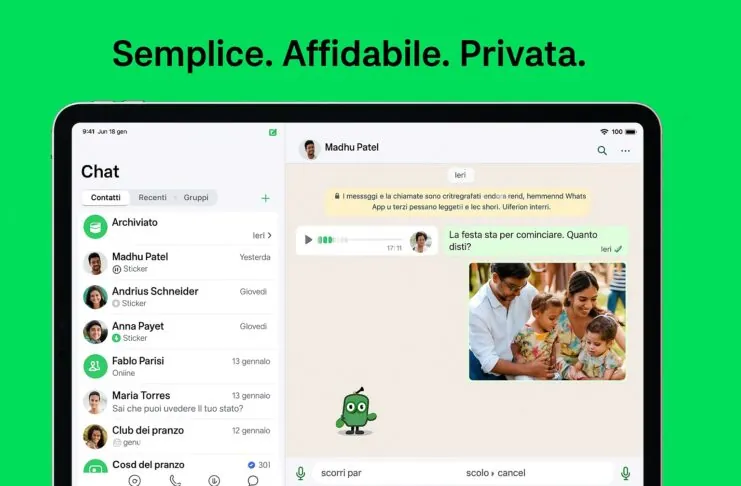 WhatsApp per iPad introduce un’interfaccia pensata per sfruttare al meglio lo schermo più ampio del tablet, con un layout a due colonne (chat a sinistra, conversazione aperta a destra) e il supporto per Split View, Slide Over e Picture in Picture.