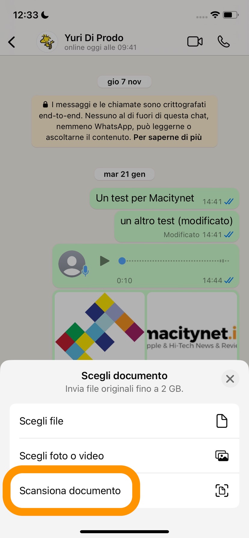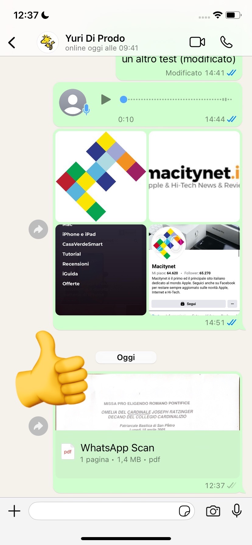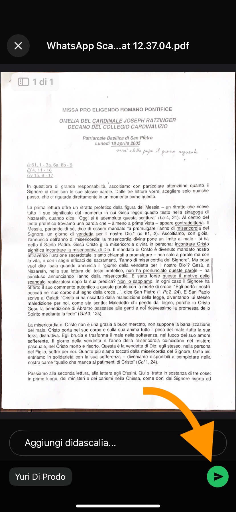 Come dicevamo, la scansione verrà allegata in formato PDF, consentendo così a chiunque di visualizzarla correttamente sul proprio dispositivo; che sia un altro iPhone, un telefono Android o un computer che sta accedendo alla chat via app o browser.