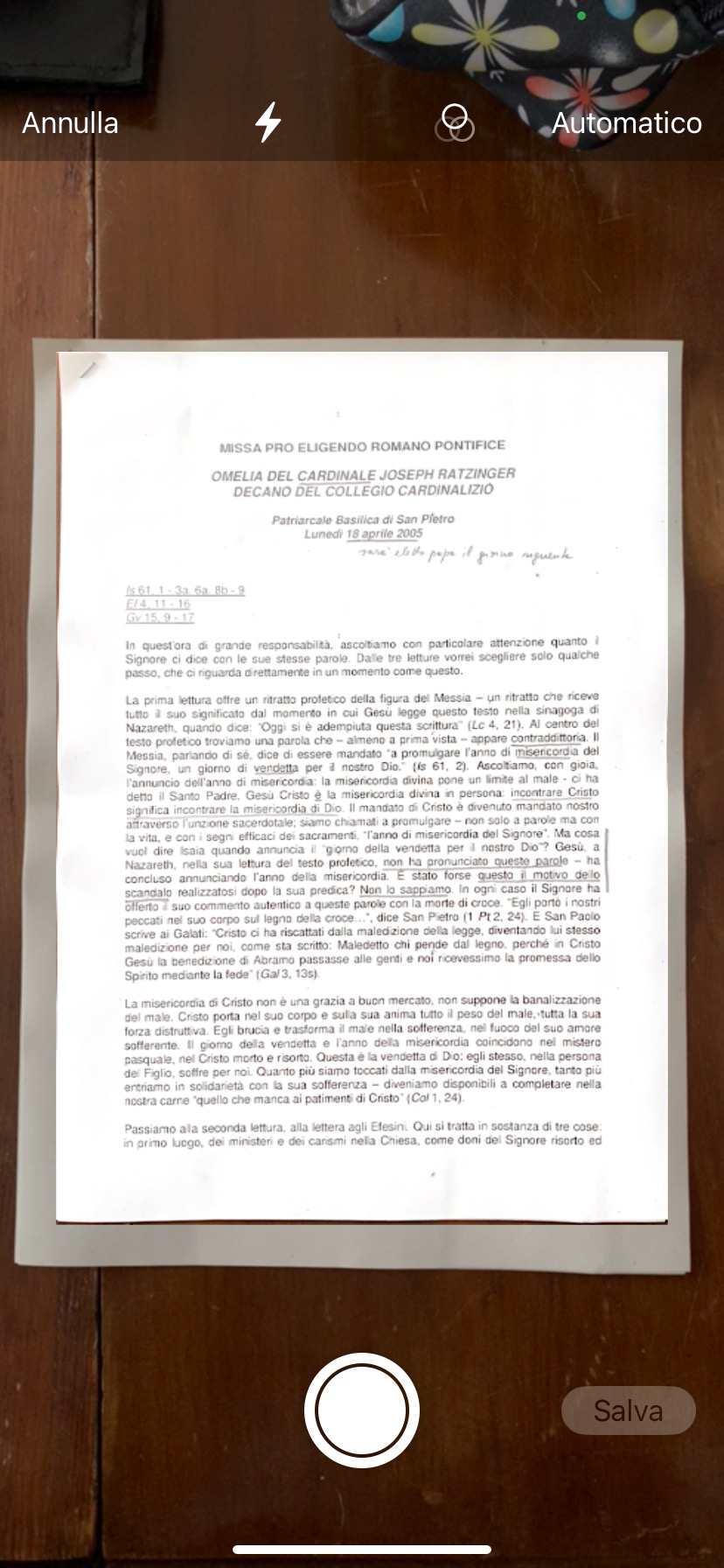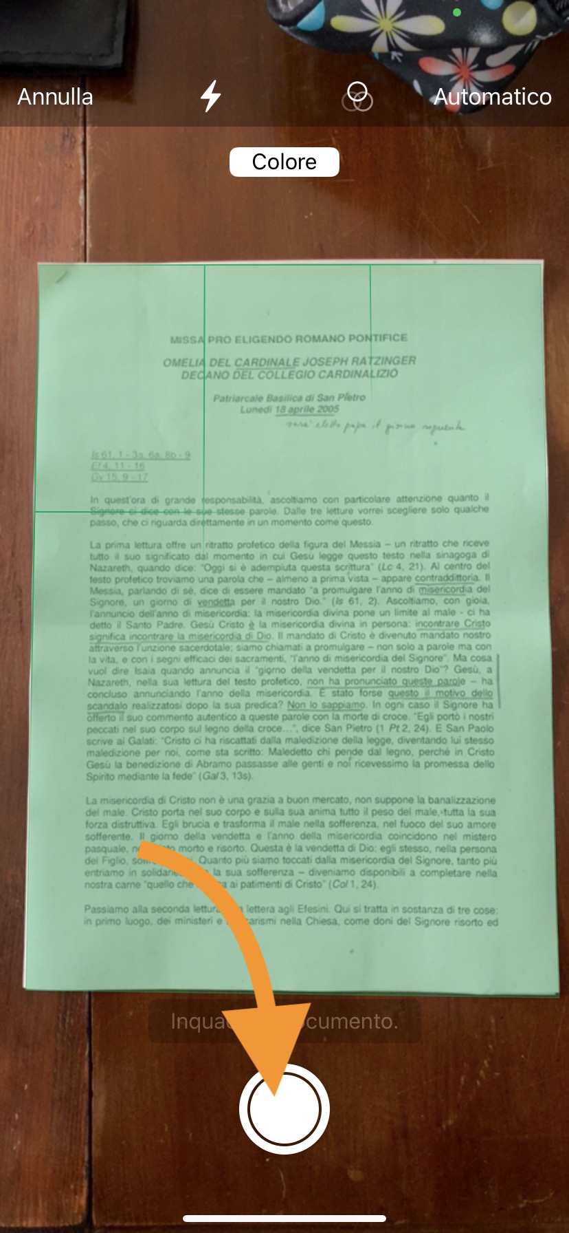 A prescindere dalla modalità impostata, l’app evidenzierà in verde il documento inquadrato non appena ne riconoscerà uno. Attendete l’acquisizione in modalità Auto oppure schiacciate il pulsante di scatto per catturare la scansione manualmente.