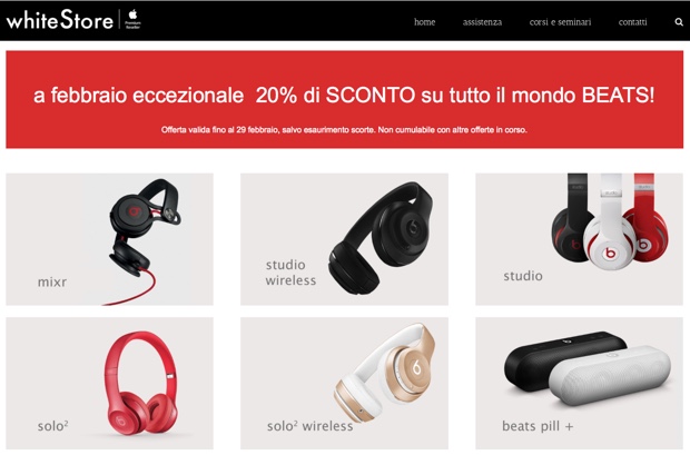 Sempre nei punti vendita whiteStore per tutto il mese di febbraio è possibile acquistare cuffie, auricolari ma anche altoparlanti Beats approfittando dello sconto del 20%. Si tratta di una ottima occasione per acquistare alcuni dei dispositivi audio più apprezzati e famosi con un sensibile risparmio sul prezzo di listino valido per le cuffie Beats mixr, le Studio Wireless, Beats Studio, Beats solo 2 con e senza fili, così come per gli auricolari urbeats e gli speaker Beats Pill+.
