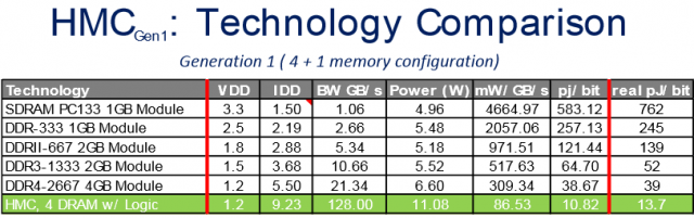 Intel e Micron propongono invece l’Hybrid Memory Cube (HMC), conduttori verticali che collegano elettricamente una pila di singoli chip per combinare dispositivi logici ad alte prestazioni con la DRAM. Con questo standard è possibile spostare i dati fino a 15 volte più velocemente rispetto a un modulo DDR3 e utilizzare fino al 70% di energia in meno e il 90% in meno di spazio rispetto alle attuali tecnologie di memoria. Secondo i promotori di questo standard, le funzionalità associate all’interfaccia astratta, l’affidabilità avanzata, la disponibilità e serviceability (RAS) dell’HMC riducono la complessità e semplificano il design dei dispositivi. L’HMC non è supportata dallo JEDEC ma tra le centinaia di partner che hanno mostrato interesse, ci sono: Micron, Microsoft, Altera, ARM, Intel, HP, Xilinx e anche Samsung. Nelle specifica 2.0 si parla di larghezza di banda di 160 GB/s usando il 70% di energia per bit in meno rispetto alle tecnologie esistenti.