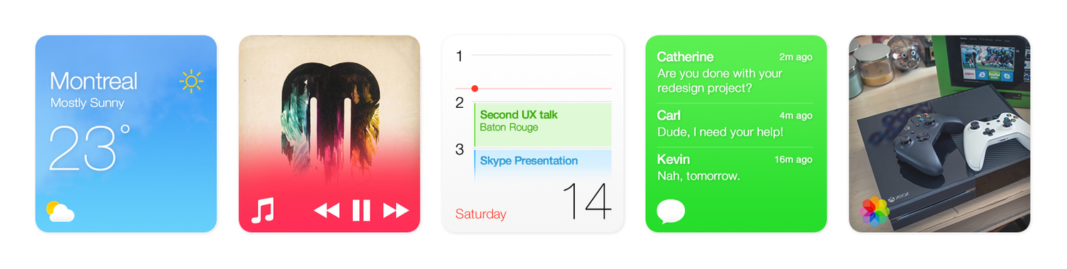 Non sappiamo se è nelle intenzioni di Apple integrare i widget su iOS 8, ma un designer si è comunque divertito ad immaginare come potrebbero essere: attraverso il classico pinch-to-zoom l’idea è quella di ingrandire sul momento le applicazioni alle quali si vuole dare una sbirciata e, in casi specifici, mantenerla aperta sotto forma di widget sempre attivo nella Homescreen. Questa l’idea di Jay Machalani che, oltre alle immagini in galleria, può essere apprezzata attraverso il video concept che inseriamo in calce in questo articolo.