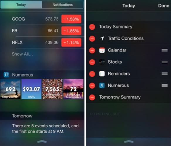 Insomma, con iOS 8 è stata aperta agli sviluppatori la possibilità di introdurre widget delle proprie app nel centro notifiche, in modo da rendere gli applicativi ancora più produttivi e interessanti per gli utenti. Attraverso i widget, infatti, molte applicazioni potrebbero risultare maggiormente interessanti per gli utenti, che avrebbero sempre a portata di slide dirette informazioni relative ad un’applicazione di proprio interesse. Numerous è solo uno dei primi esempi.