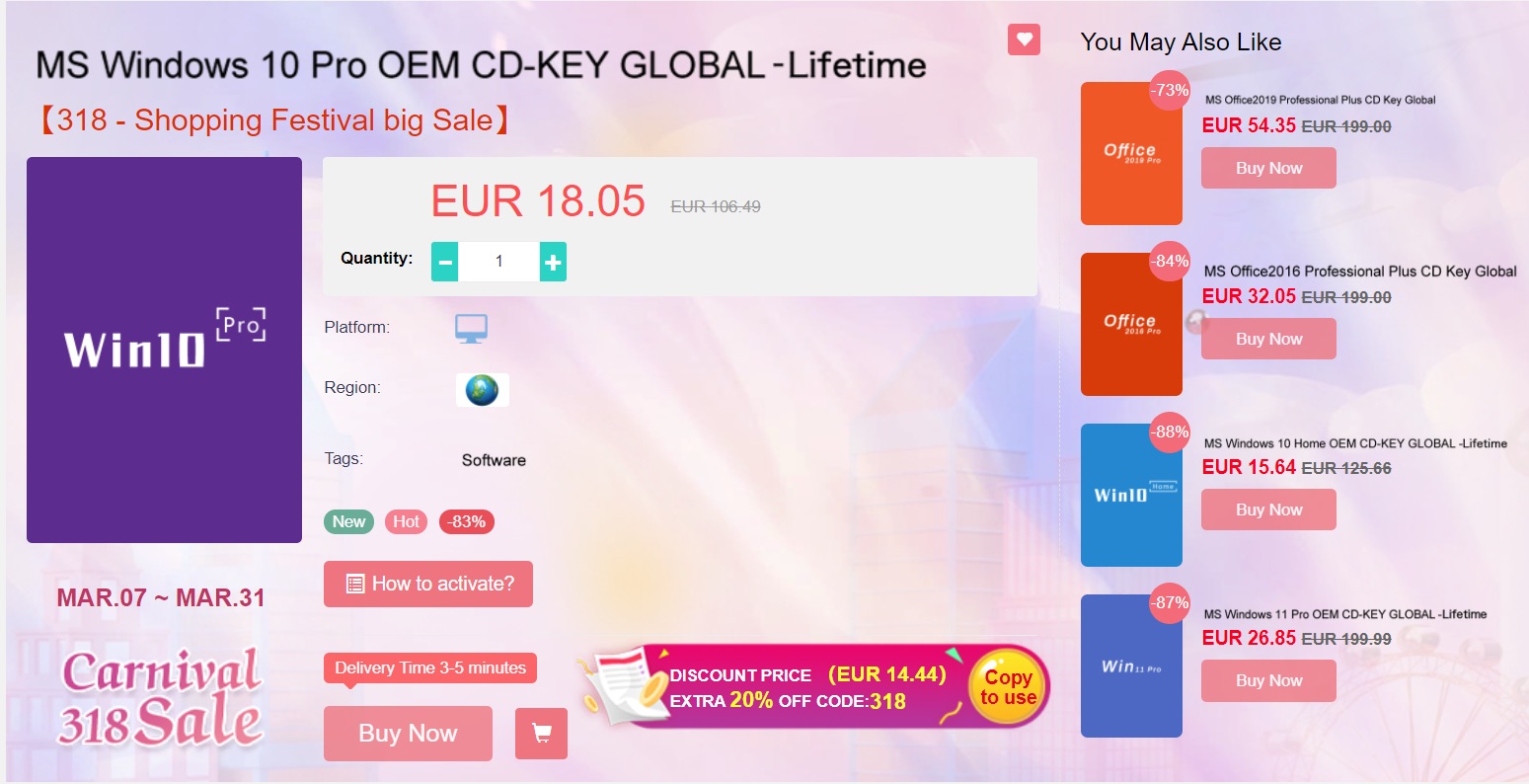 Windows 10 Pro OEM KEY a 12.64EUR (dopo il 30% di sconto con coupon MAC)
