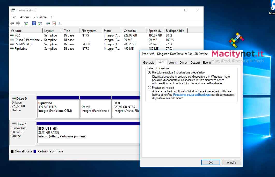 Finora le policy di sistema attive per default al collegamento di un dispositivo USB erano impostate su “Prestazioni migliori”. Questo criterio consente di gestire le operazioni di archiviazione con modalità che nel complesso migliorano le prestazioni.