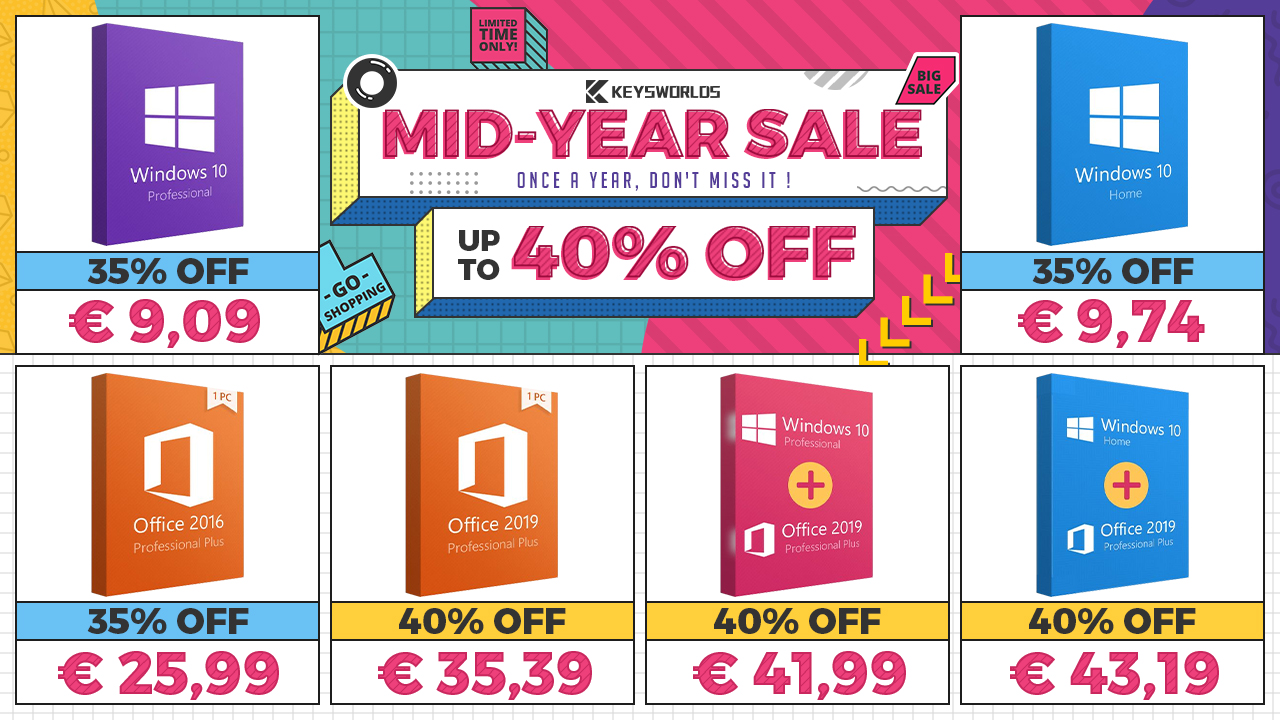 La stagione dello shopping estivo 2020 è iniziata e fra la offerte più interessanti c’è sicuramente la possibilità di acquistare software su KeysWorlds con sconti dal 35% al 40% di sconto che ti consentono di acquistare Windows 10 a soli € 9,09 e la serie MS Office a prezzi fortemente scontati.