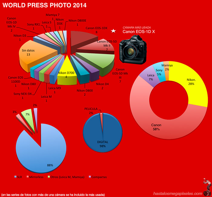 C’è ancora molta strada da fare per le fotocamere mirrorless: uno studio sulle immagini premiate per il World Press Photo 2014 mostra come la percentuale della nuova generazione di macchine fotografiche sia oggi molto bassa: solo il 3% delle immagini premiate è stato realizzato con una mirrorless. Lo studio è stato condotto da Hastalosmegapixeles.com, che ha rilasciato un’infografica con i dati più interessanti osservando i premi assegnati per il World Press Photo 2014, il prestigioso concorso che assegna premi e riconoscimenti alle fotografie più rappresentative dell’anno, in particolare immagini di fotogiornalismo che hanno anche buone probabilità di restare nella storia.