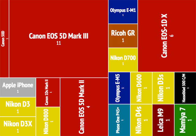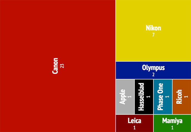 Il sito Quesabesde ha inoltre realizzato una visualizzazione grafica della fotocamere e dei marchi utilizzati per scattare le fotografie premiate. Ancora una volta è Canon a dominare con 23 delle foto premiate scattate con una fotocamera Canon, oltre il 50 per cento considerando che le fotografie premiate sono state 38. Segue ben distanziata Nikon con sette fotografie e poi Olympus, che con le sue due immagini premiate riesce ad ottenere un piazzamento simbolico non solo per il suo marchio ma anche per il segmento mirrorless, di cui Olympus è l’unica rappresentante in questa particolare classifica.