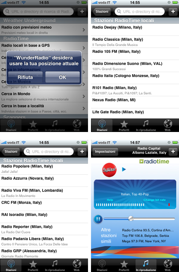 Una volta installato il software richiede immediatamente di poter utilizzare le funzioni di localizzazione di iPhone e touch: oltre al GPS di iPhone Wunder Radio è in grado di localizzare l’utente tramite Wi-Fi. Se l’utente acconsente, il programma individua in modo automatico tutte le stazioni radio disponibili nelle immediate vicinanze. Gli utenti di iPhone 3G potranno così disporre in pochi istanti di un elenco completo delle stazioni radio, persino quelle locali e della città in cui vive se disponibili e se il centro è di una certa dimensione. Per chi invece utilizza iPhone Edge e iPod touch Wunder Radio individua da solo un corposo elenco delle principali stazioni italiane. Per iniziare l’ascolto è sufficiente un tap del dito sul nome della stazione: dopo una breve attesa per creare il buffer, il tempo dipende dal collegamento disponibile e dalla qualità del segnale della web radio, possiamo iniziare subito l’ascolto.