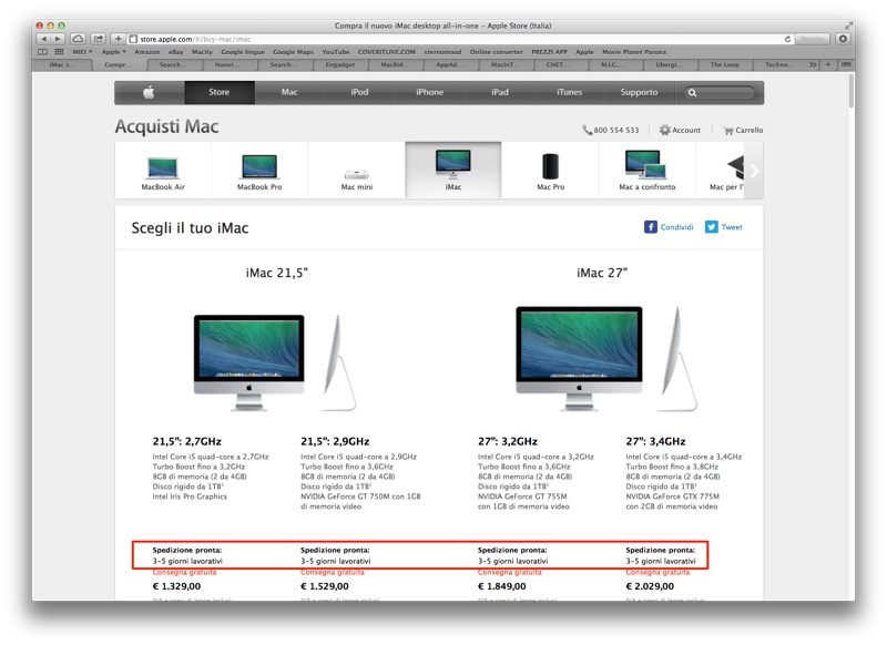 Ora all’anticipazione di Kuo si aggiunge però un altro segnale interessante: insolitamente i tempi di consegna degli iMac attualmente a listino Apple sono aumentati dalle tradizionali 24 ore a 3-5 giorni per le macchine in configurazione standard. Questo vale sia per gli iMac da 21,5” che per i modelli più grandi, potente e costosi iMac 27”. Notiamo inoltre che personalizzando la configurazione, semplicemente incrementando la RAM installata, una unità Fusion al posto del disco fisso oppure integrando un processore più potente, i tempi di consegna aumentano fino ad arrivare a 7-10 giorni.