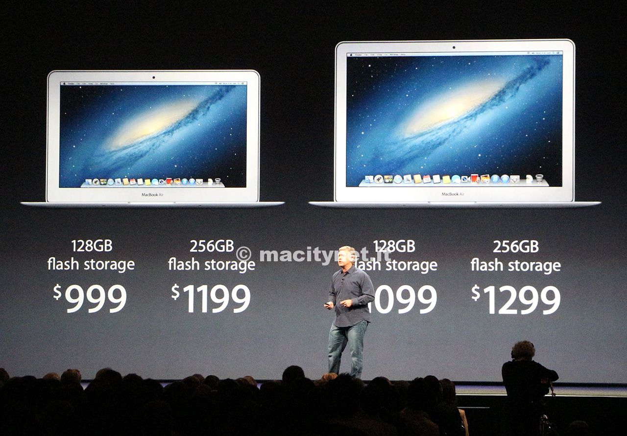 Il MacBook Air 11 pollici ha un processore a 1.3 GHz con velocità Turbo Boost fino a 2.6 GHz, 4GB di memoria ed è disponibile con 128GB di storage flash a partire da €1.029 IVA e tasse incluse, e con 256GB di storage flash a partire da €1.229 IVA. Il MacBook Air 13 pollici da 1.3 GHz , 4GB di memoria con 128GB di storage flash parte da €1.129 IVA; con 256GB di storage flash costa €1.329 IVA e tasse incluse Opzioni possibili all’ordine includono un processore Intel Core i7 da 1.7 GHz con velocità Turbo Boost fino a 3.3 GHz, fino a 8GB di memoria e fino a 512GB di storage flash. I nuovi MacBook Air sono in spedizione a 24 ore sull’Apple Store.