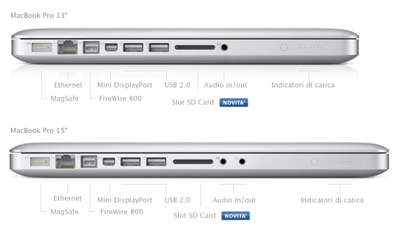 Due le versioni in vendita per il MacBook Pro da 13 pollici: processore da 2.26Ghz, 160 Gb di , 2GB di Ram e scheda grafica da 9400M a 1149 euro; processore da 2.53Ghz, 2500 Gb di memoria e 4GB DDR3 di ram e scheda grafica da 9400M a 1399 euro. Tutte includono slot SD Card.