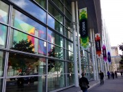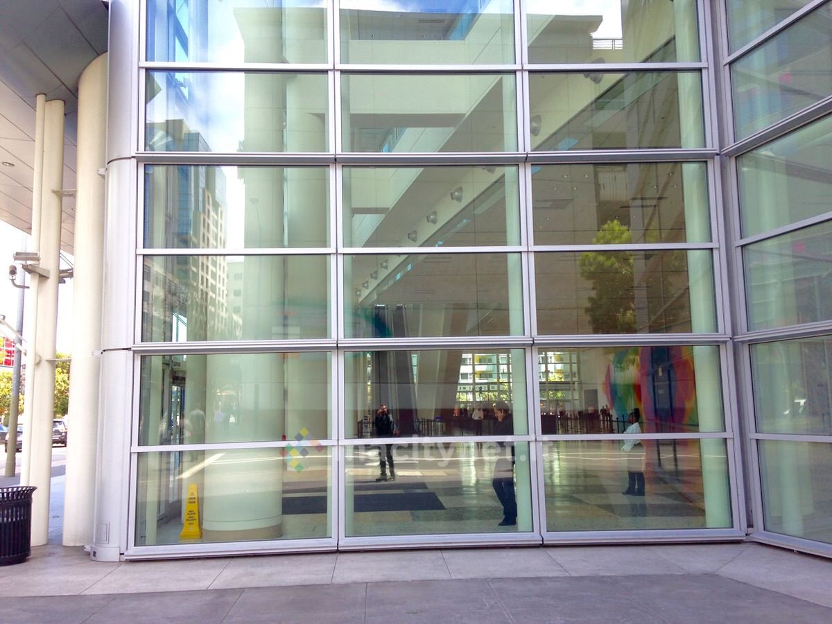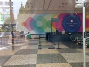 Apple in particolare ha sistemato anche alcuni imponenti riquadri con il caratteristico logo multicolore, sul Metreon, un centro commerciale (con multisala cinematografica) che si trova proprio a lato del Moscone. In questo modo chiunque si affaccerà dal Moscone, i cui corridoi esterni sono completamente vetrati, vedrà di fronte le insegne e anche chi passa sulla strada che separa i due edifici sarà “circondato” dagli striscioni che si rifletteranno nelle vetrate del centro congressi.