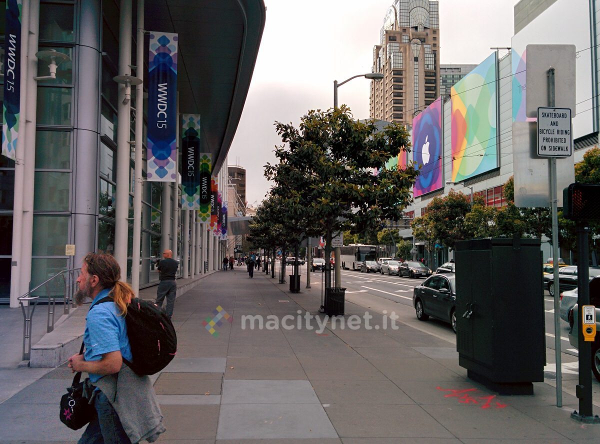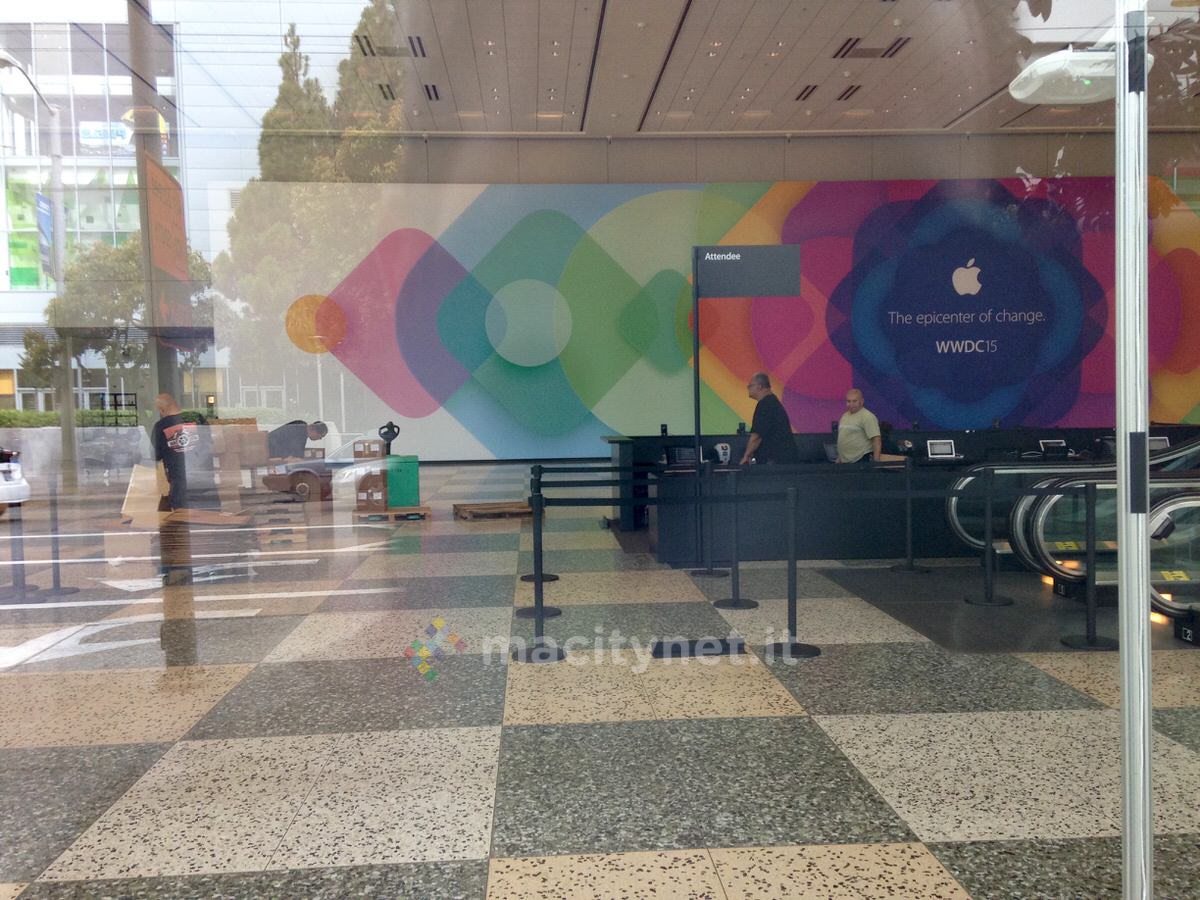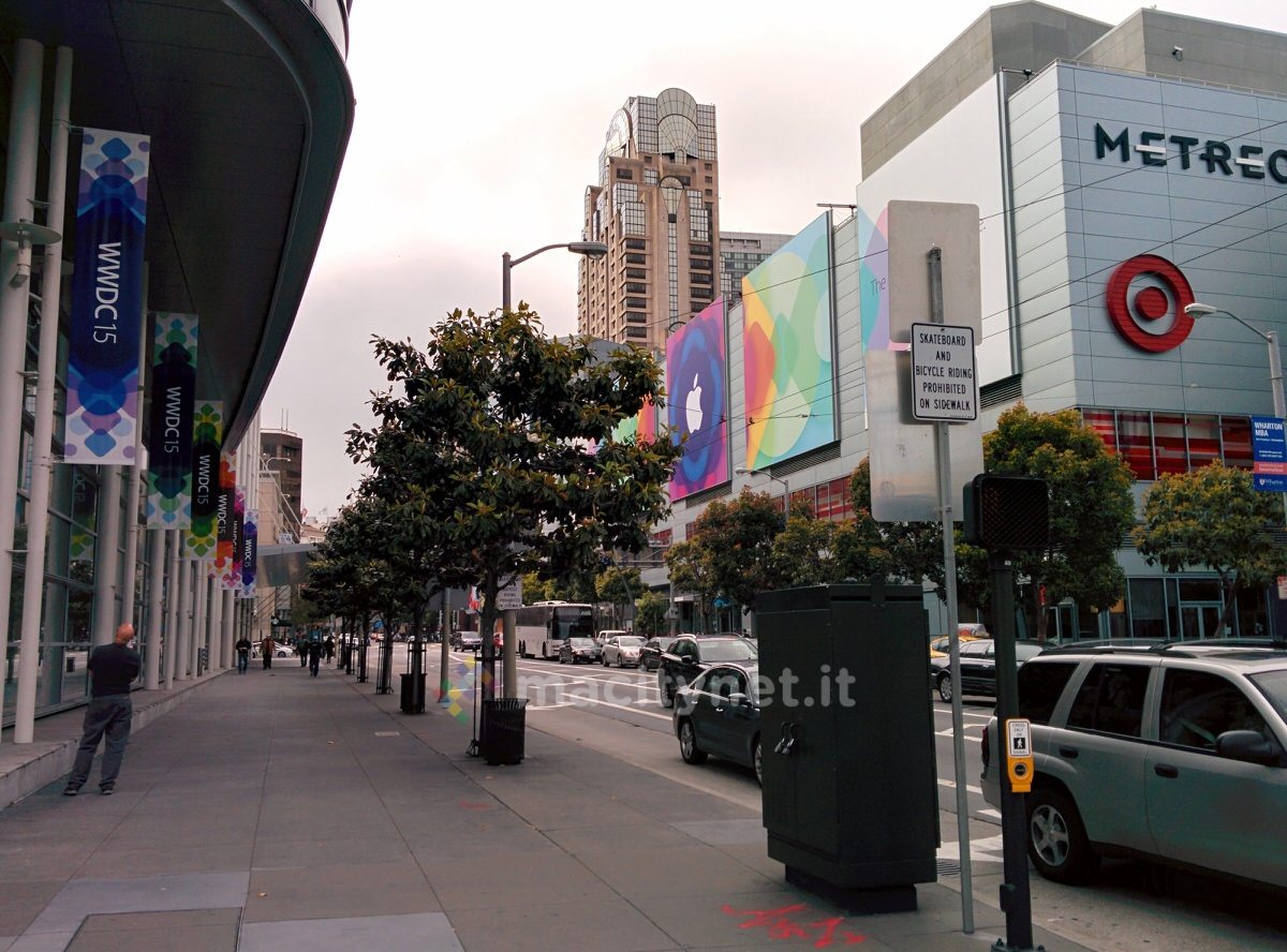Come sempre accade, oggi sarà la giornata più intensa di quelle preparatorie alla WWDC15. L’evento si apre lunedì, ma la domenica tradizionalmente è il momento in cui al centro congressi del Moscone si affollerà la maggior parte degli sviluppatori che si metteranno in fila ai banchi delle registrazioni. Per questo nel corso di tutto sabato, gli addetti hanno lavorato intensamente per concludere le decorazioni, dentro e fuori della struttura che ospiteranno sia il keynote che le varie sessioni.