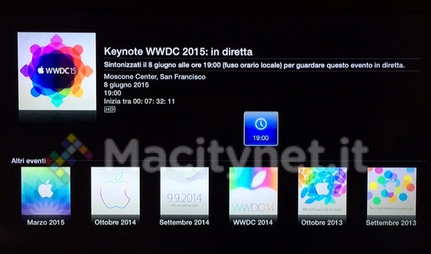 Selezionandolo vengono visualizzati i dettagli della trasmissione: la diretta della WWDC15 su Apple TV inizia questa sera alle ore 19, orario italiano, che corrispondono alle 10 del mattino a San Francisco. Più in basso è anche visualizzato il conto alla rovescia con il tempo che manca all’inizio della trasmissione. In fondo alla pagina è disponibile invece l’elenco dei Keynote di Apple precedenti che possono essere selezionati e rivisti direttamente su Apple TV.