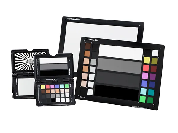 Più completa l’offerta del ColorChecher video, che include due serie di scacchiere in scala di grigi: 7 quadrati più piccoli per grigi bilanciati con passaggi aggiuntivi in prossimità delle regioni delle alte luci e ombre, e 4 grandi rettangoli per il livello di grigio, tra cui un nero lucido, facilmente riconoscibili dalla fotocamera. Disponibile infine una gamma di tonalità per la pelle, e una scala di regolazione per la saturazione e per il bilanciamento del bianco.