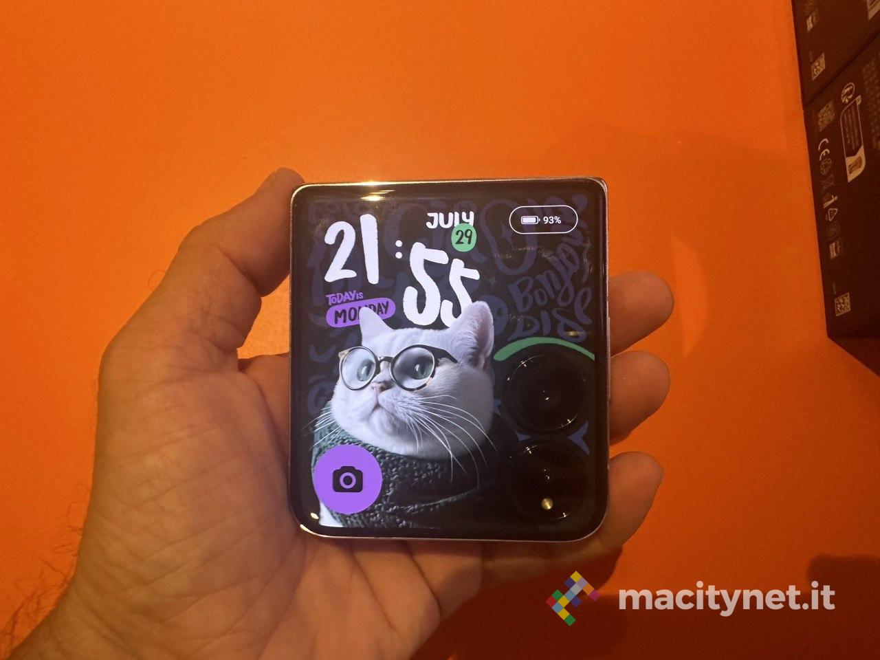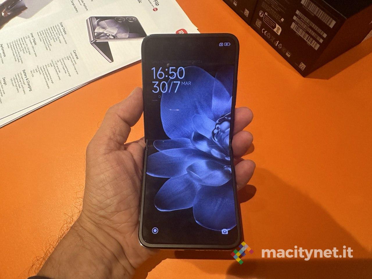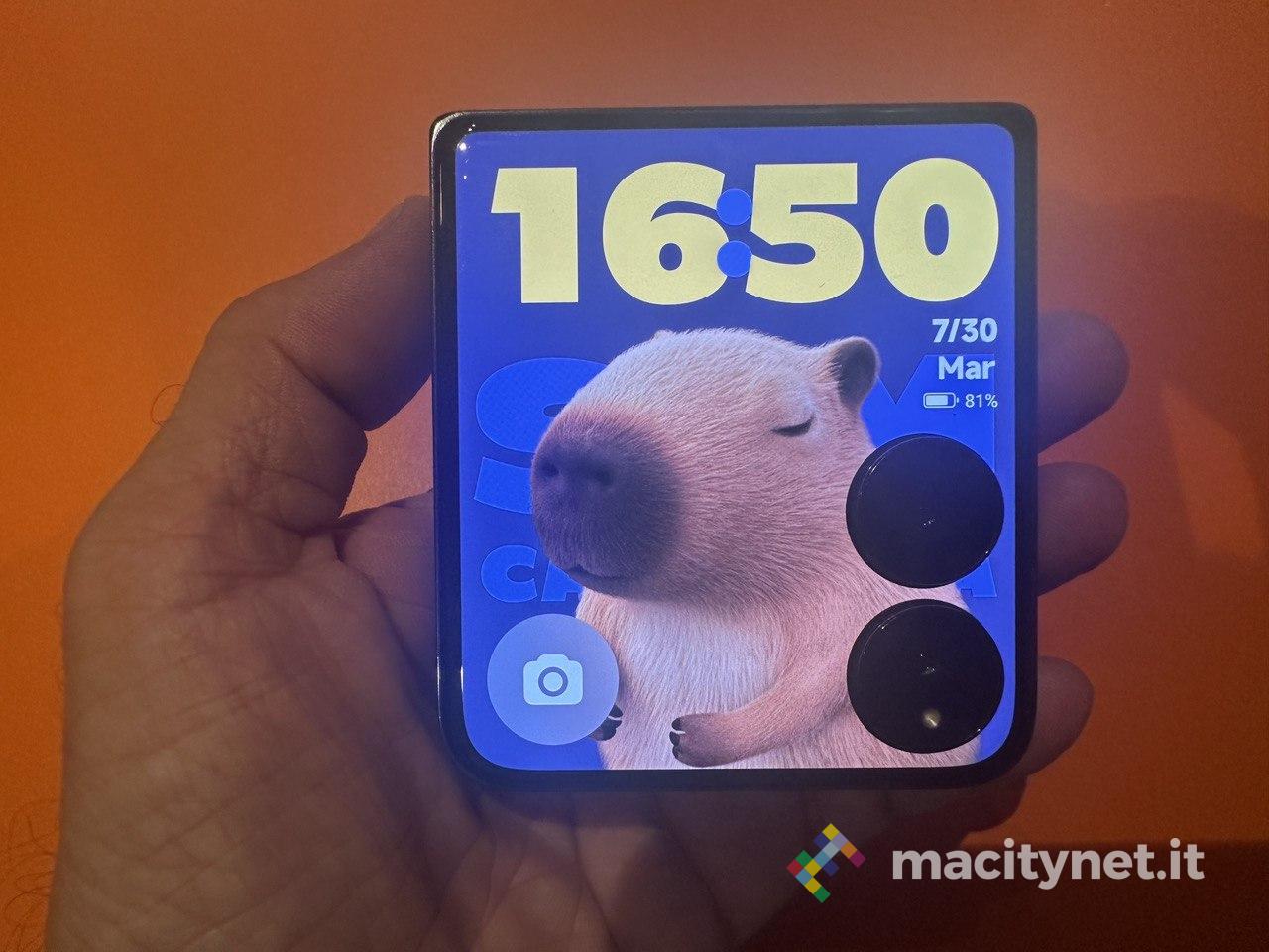 Mette a disposizione uno schermo esterno da 4,01” da 1.392 x 1.208 pixel e densità di 460ppi, aggiornamento fino a 120Hz con svariate funzioni gestite da HyperOS che permettono anche di rispondere alle chiamate senza dover aprire il terminale.