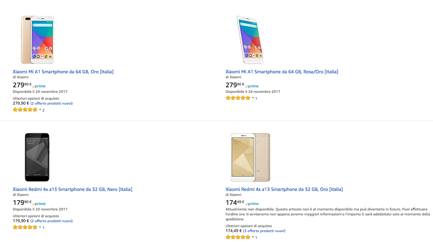 I prodotti venditi da Amazon sono gli Xiaomi Mi A1, Xiaomi Redmi 4X, (spedizione 24 novembre) e Xiaomi Note 4, (23 novembre) con un listino di rispettivamente a 279,90 euro, 179,90 euro e 237,52 euro. I prezzi sono, purtroppo, nettamente più elevati rispetto a quello che costeranno in Spagna ma soprattutto ai prezzi cui è possibile acquistare gli stessi dispositivi sugli e-store cinesi.