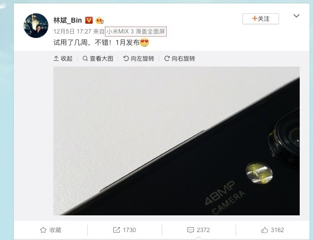Il co-fondatore di Xiaomi e il presidente Lin Bin hanno infatti recentemente anticipato uno smartphone con un modulo fotocamera da 48MP attraverso un’immagine pubblicata sulla piattaforma social media cinese Weibo. L’immagine postata mostra il primo piano di una fotocamera posteriore con un’etichetta ’48MP camera’ accanto all’obiettivo. Bin dice di aver usato il telefono per alcune settimane e che sarà rilasciato a gennaio.