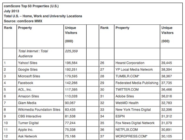 Yahoo ha di nuovo raggiunto la cime della la lista di ComScore delle 50 proprietà web più trafficate nel luglio 2013 in USA, superando di poco Google per la prima volta dal maggio 2011. I dati non includono il traffico proveniente dalle recenti acquisizioni della società, fra cui i 133 milioni di blog di Tumblr e le altre minori proprietà che non avrebbero comunque avuto un notevole impatto sul traffico. Yahoo ha quindi aumentato il traffico dei suoi siti esistenti anche se è difficile sapere nel dettaglio quale di essi abbia decretato il sorpasso sulla rivale: i siti più popolari di Yahoo sono sicuramente Yahoo, Flickr, Yahoo News, Yahoo Finance e Yahoo Answers.