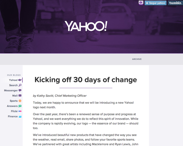 Yahoo! vuole un nuovo logo e in un video pubblicitario mostra ipotetiche possibili forme, varie bozze di quello che diventerà il nuovo marchio aziendale. Sino al 4 settembre diverse varianti saranno mostrate su Tumblr e sulle homepage dei vari network della società. L’unica cosa certa è che il colore porpora, il punto esclamativo e il famoso yodel (il richiamo sonoro) rimarranno. La scelta definitiva sarà fatta il 4 settembre.