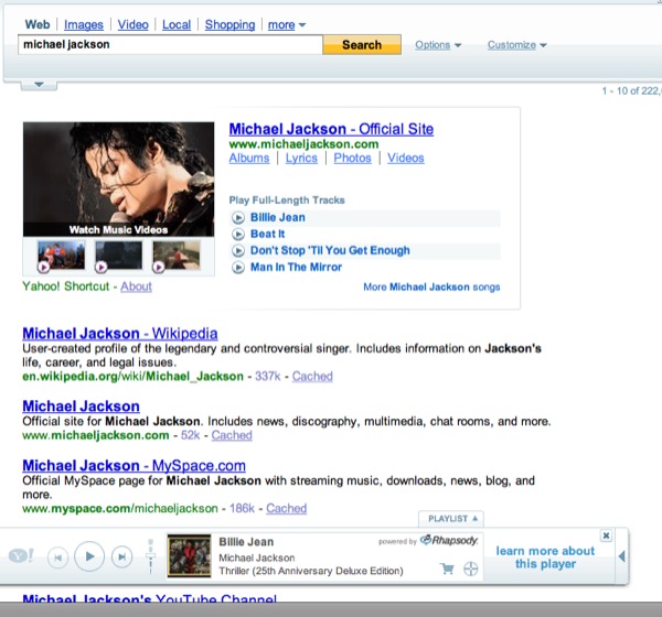 Da qualche giorno Yahoo! ha iniziato ad implementare come risultato per le sue ricerche alcuni brani musicali, tratti dal catalogo del servizio Rhapsody, con cui la società di Sunnyvale ha un accordo.